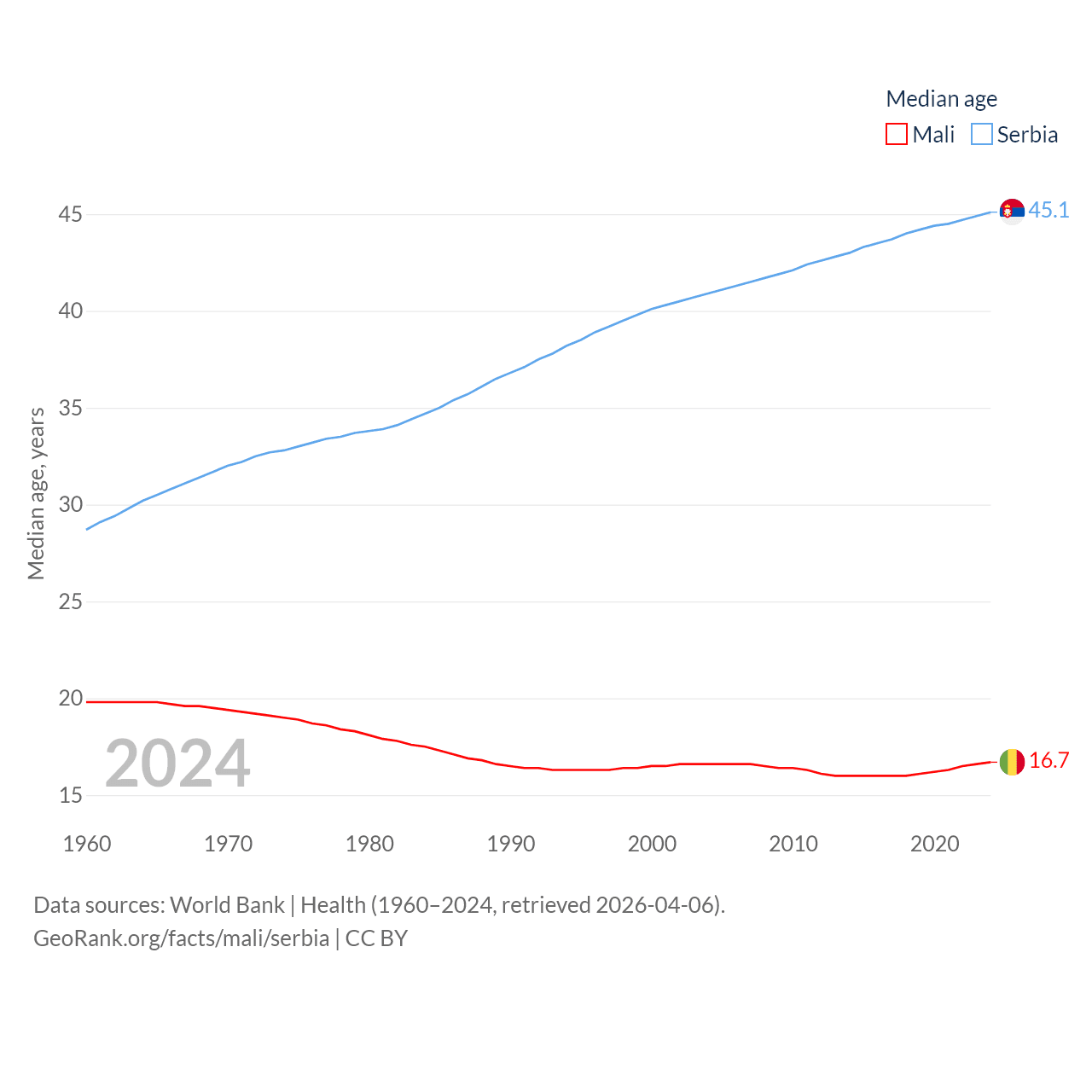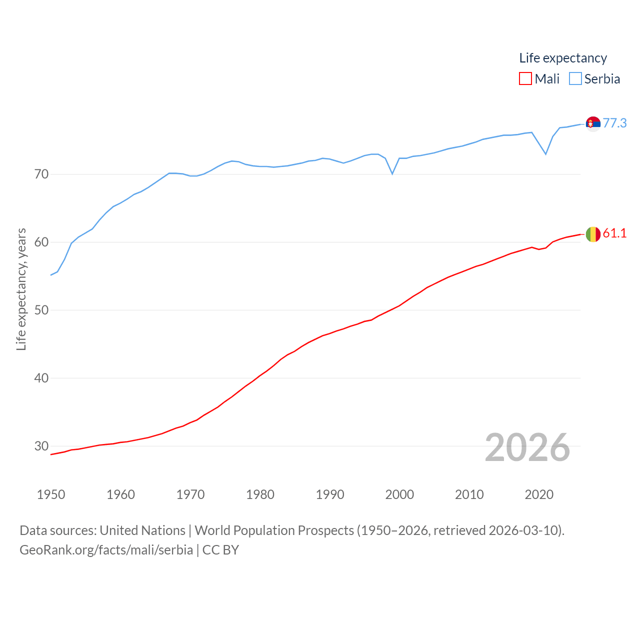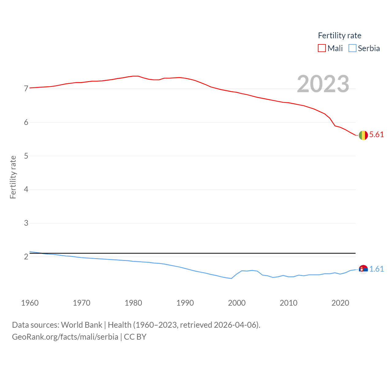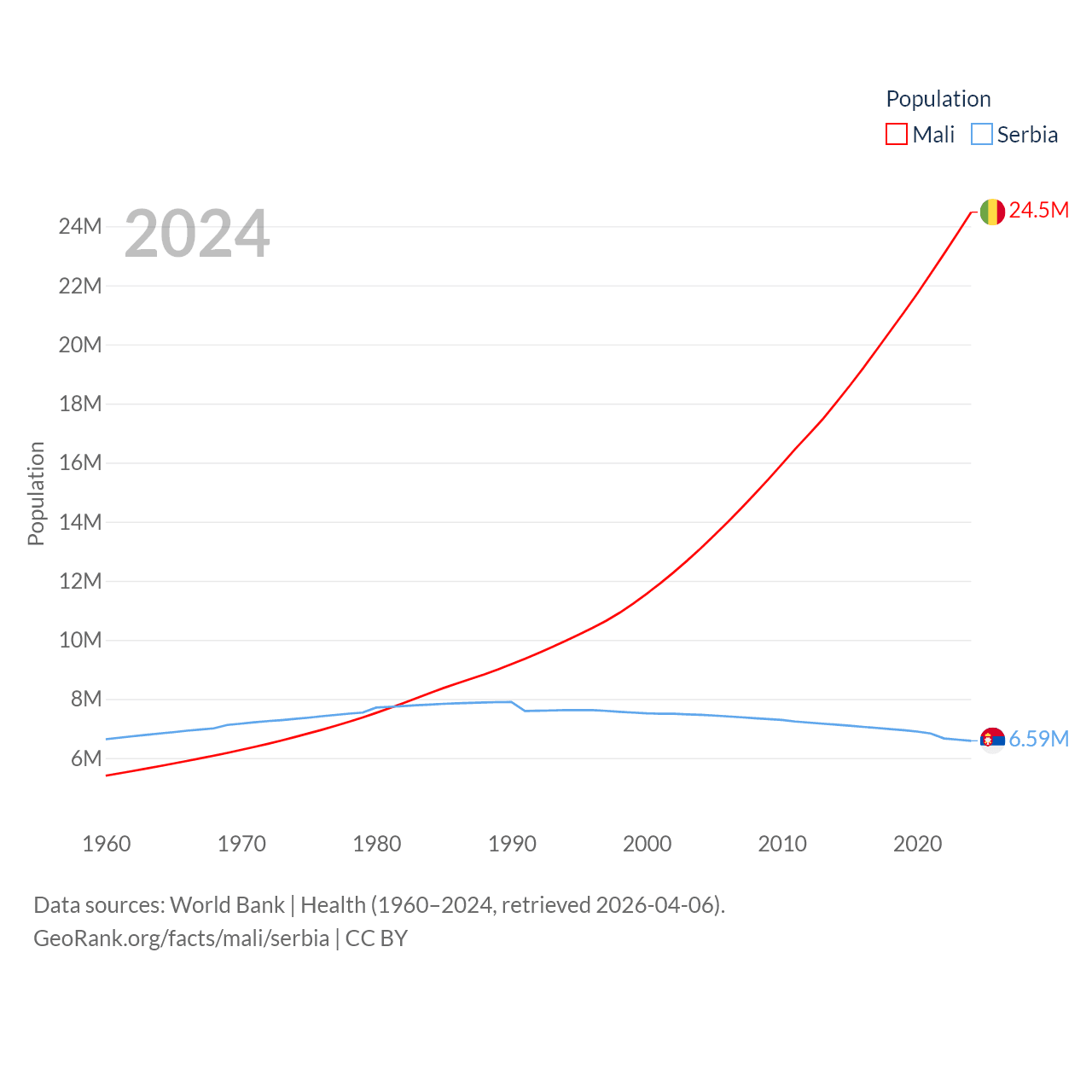 Mali has a population of 24.5M (ranked 58/197), compared with 6.59M in Serbia (ranked 109/197). Mali's land area is 471,118 sq mi versus 32,467 sq mi for Serbia (ranked 23rd vs. 111th).