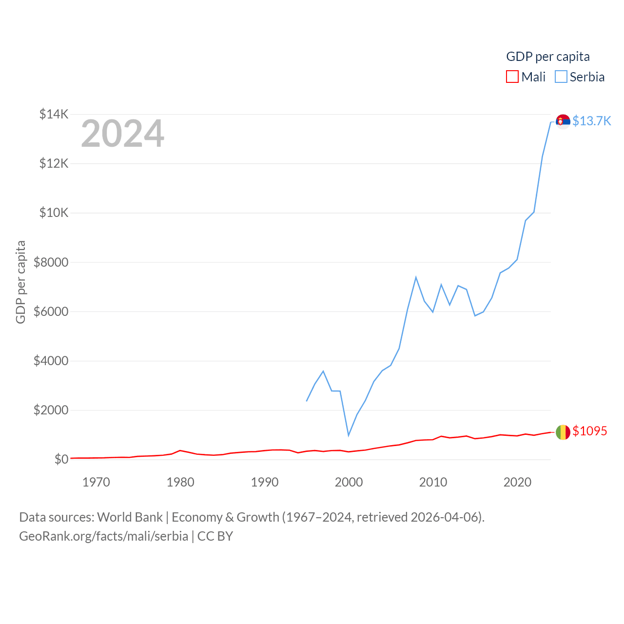 By GDP, Mali ranks 113/197 ($26.8B) and Serbia ranks 76/197 ($90.1B). By GDP per capita, Mali ranks 173/197 ($1,095), while Serbia ranks 73/197 ($13,679).
