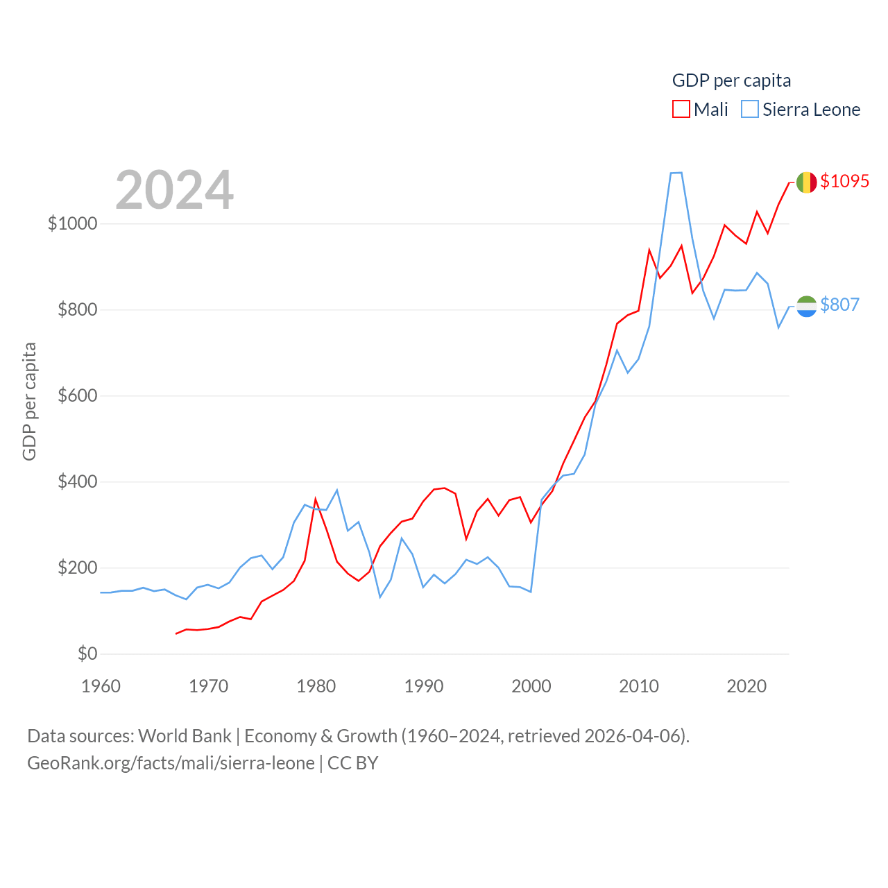 By GDP, Mali ranks 113/197 ($26.8B) and Sierra Leone ranks 160/197 ($6.97B). By GDP per capita, Mali ranks 173/197 ($1,095), while Sierra Leone ranks 186/197 ($807).
