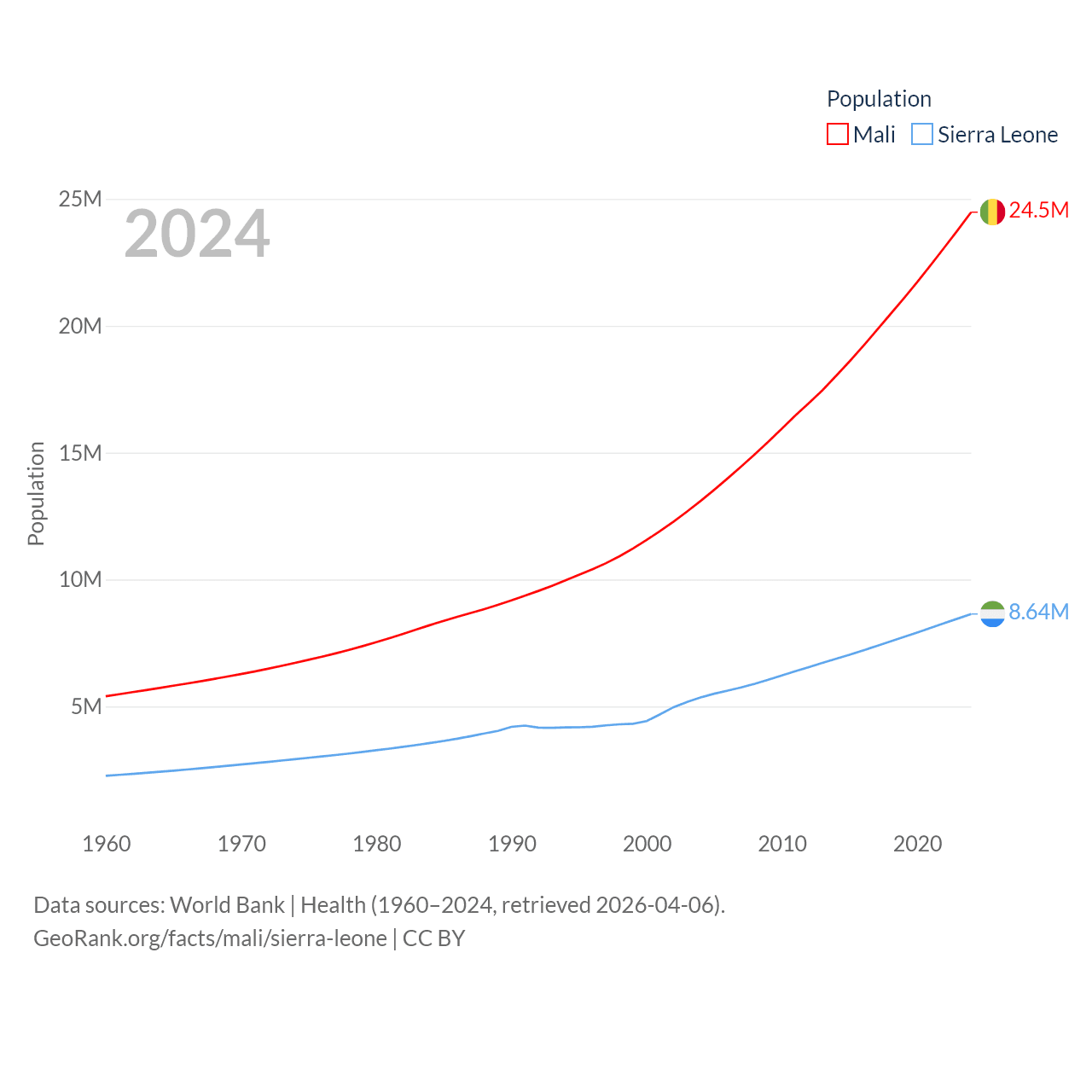 Mali has a population of 24.5M (ranked 58/197), compared with 8.64M in Sierra Leone (ranked 102/197). Mali's land area is 471,118 sq mi versus 27,869 sq mi for Sierra Leone (ranked 23rd vs. 116th).