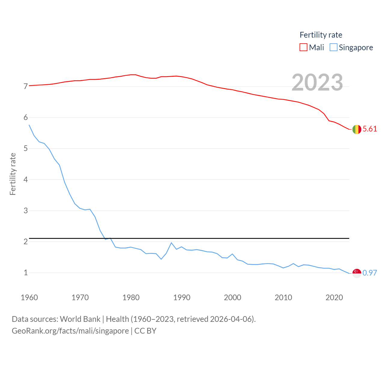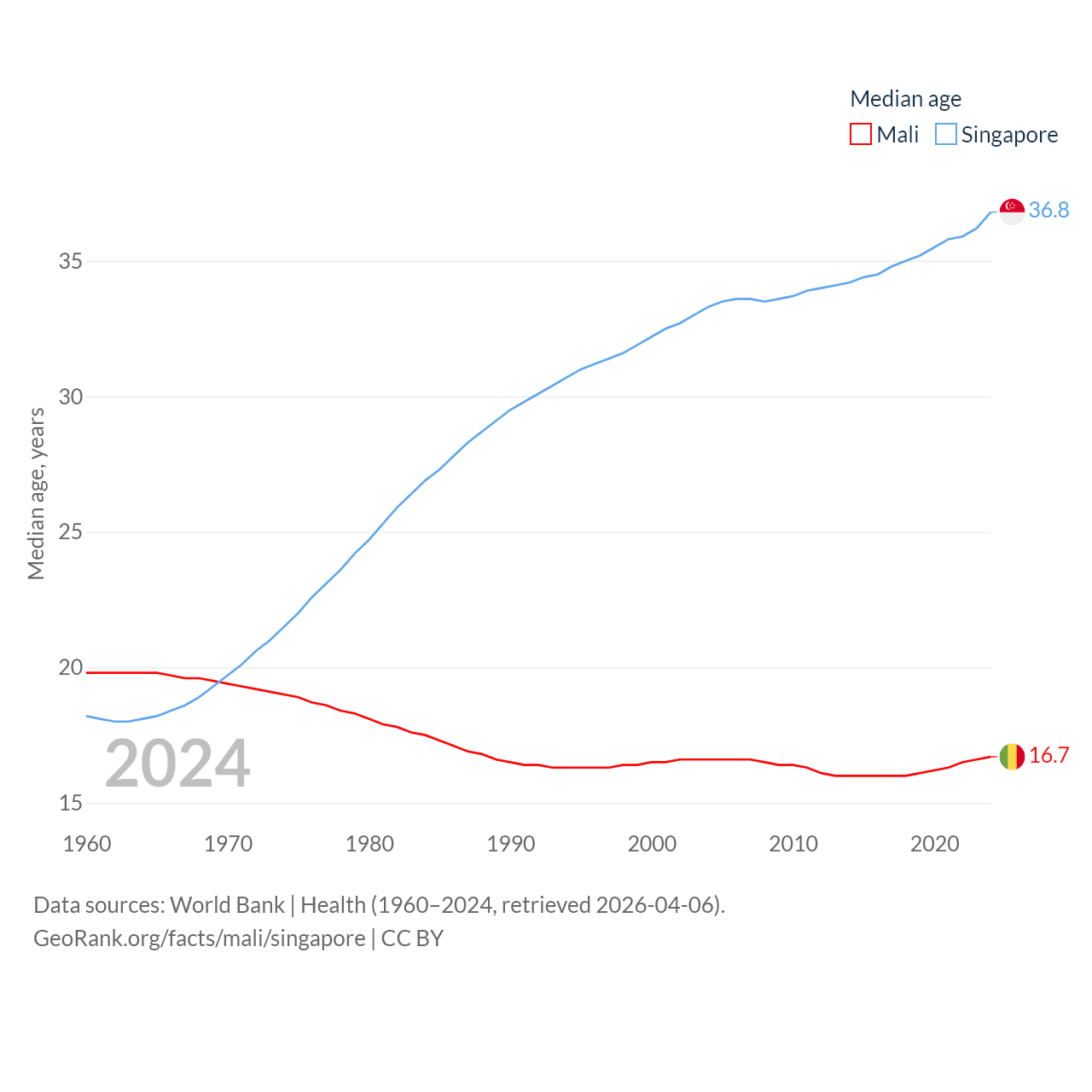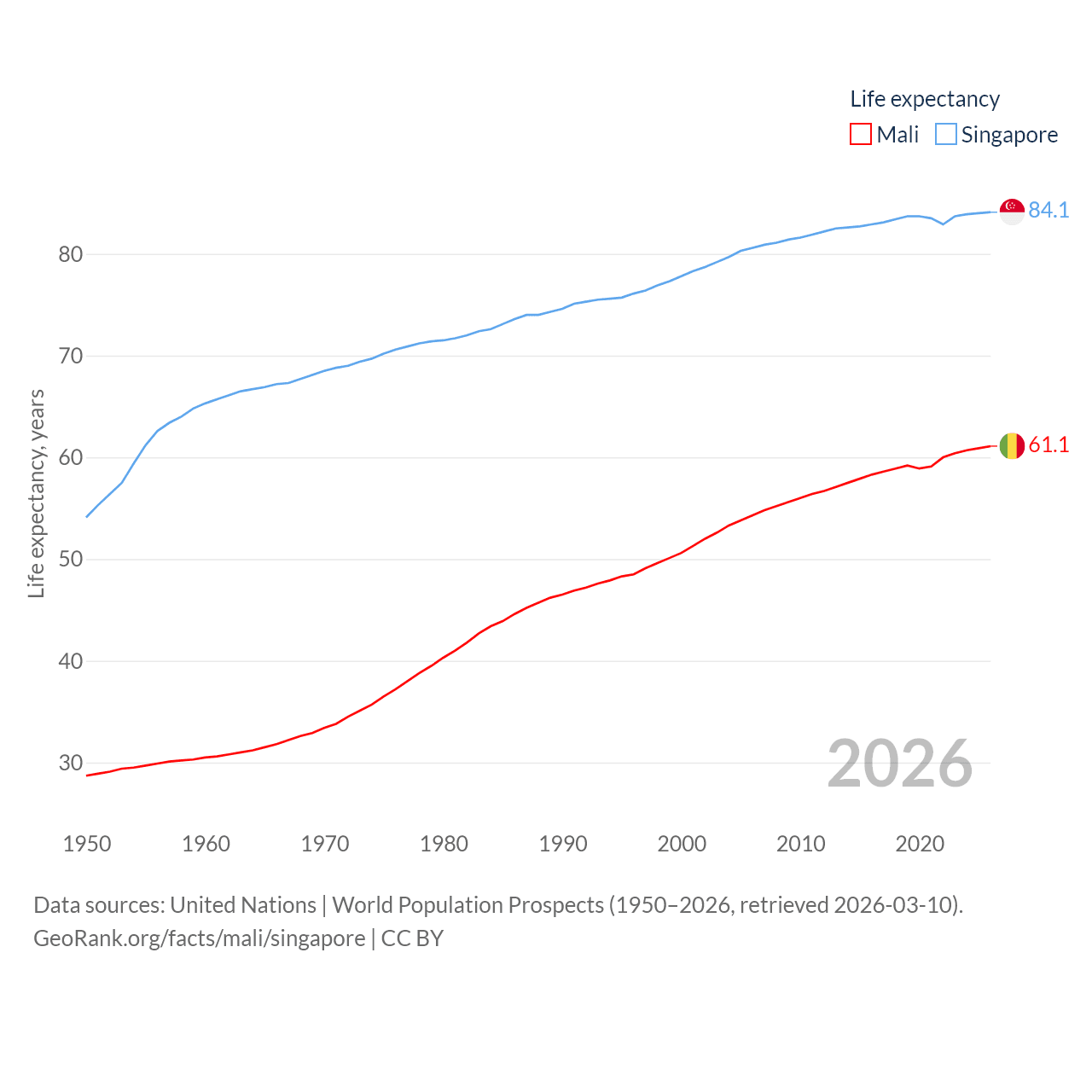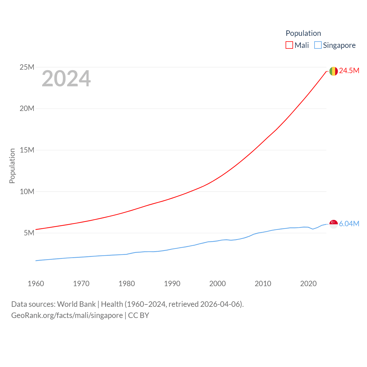 Mali has a population of 24.5M (ranked 58/197), compared with 6.04M in Singapore (ranked 113/197). Mali's land area is 471,118 sq mi versus 277.2 sq mi for Singapore (ranked 23rd vs. 177th).