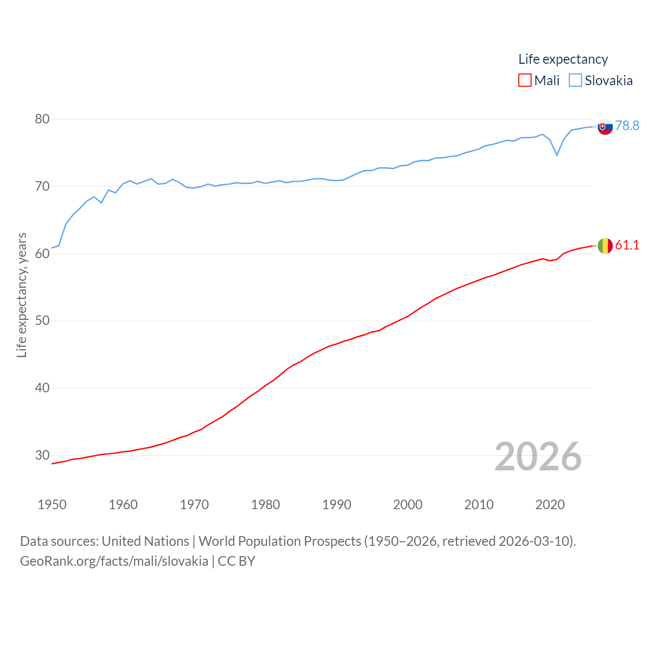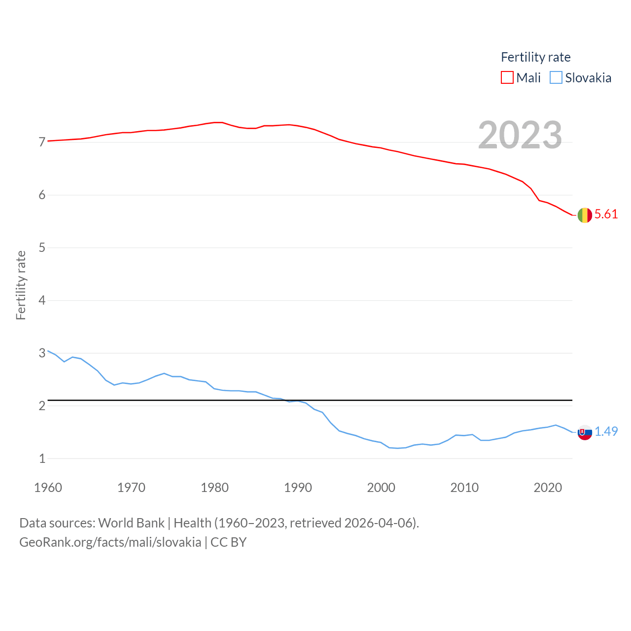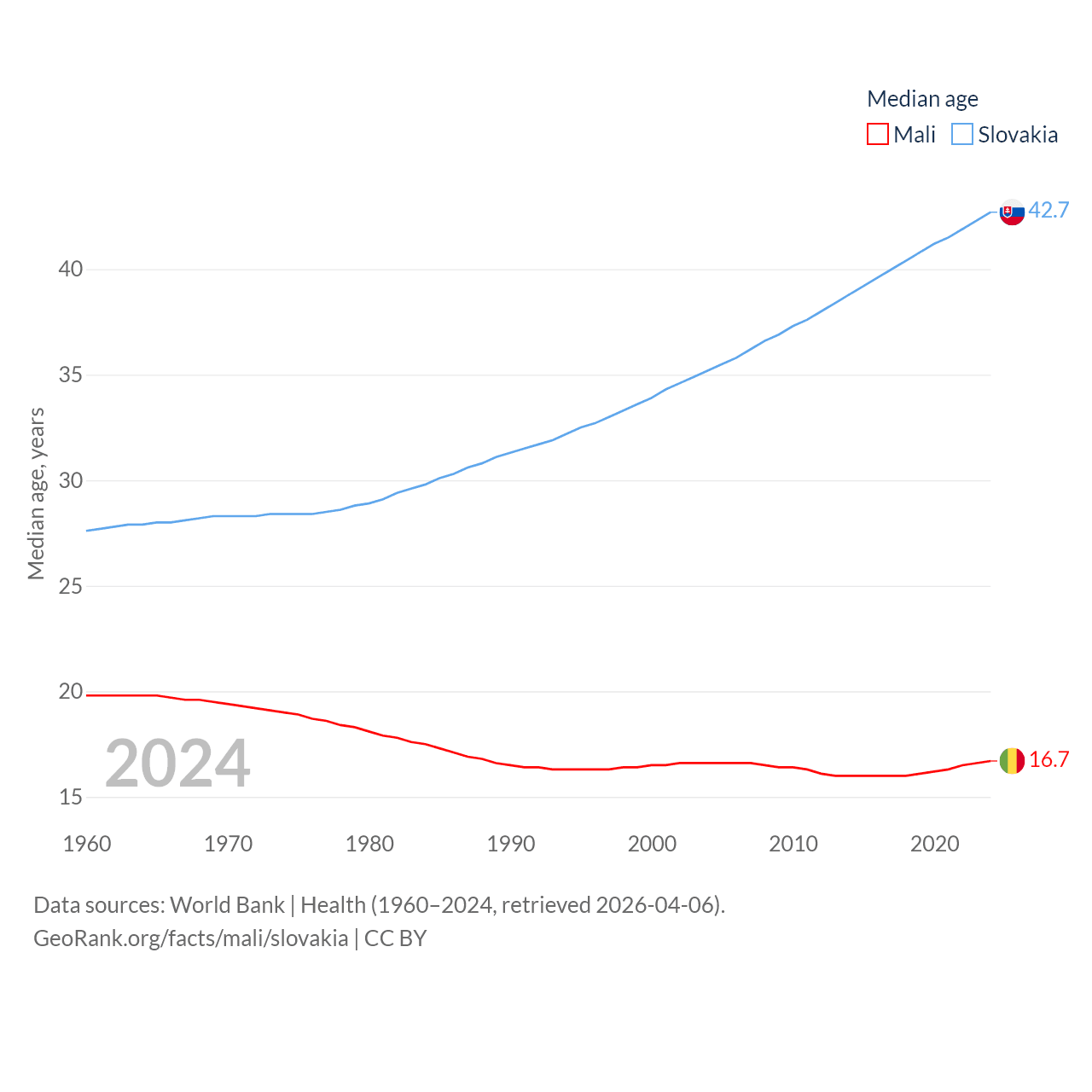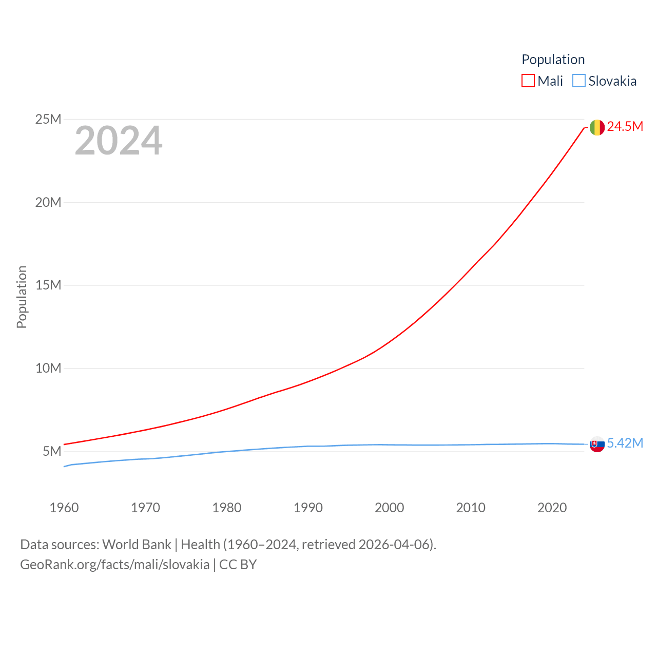 Mali has a population of 24.5M (ranked 58/197), compared with 5.42M in Slovakia (ranked 119/197). Mali's land area is 471,118 sq mi versus 18,564 sq mi for Slovakia (ranked 23rd vs. 128th).