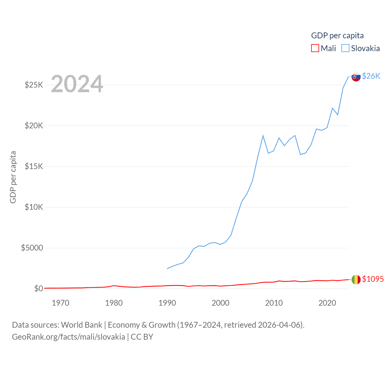 By GDP, Mali ranks 113/197 ($26.8B) and Slovakia ranks 61/197 ($141B). By GDP per capita, Mali ranks 173/197 ($1,095), while Slovakia ranks 47/197 ($25,993).