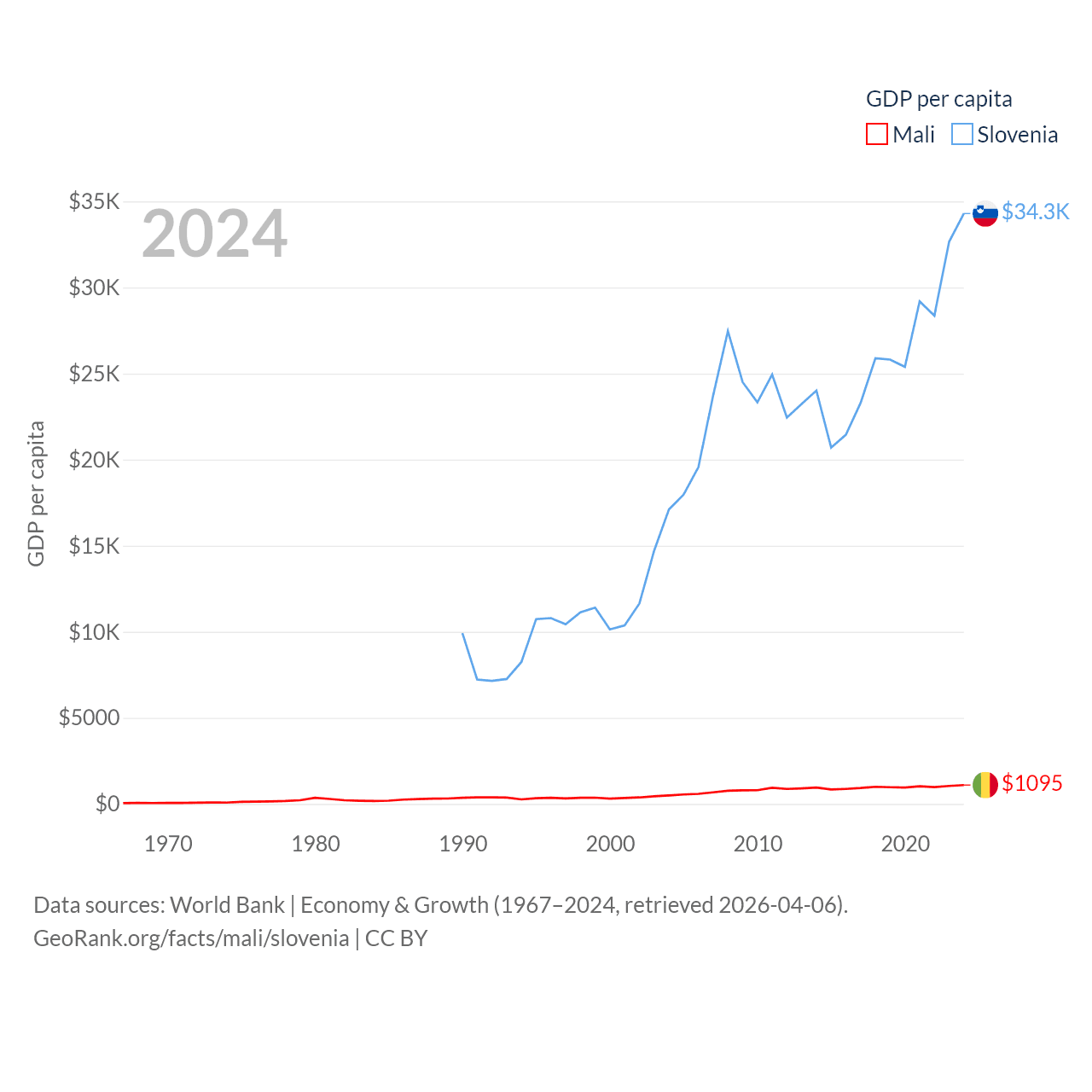 By GDP, Mali ranks 113/197 ($26.8B) and Slovenia ranks 86/197 ($73B). By GDP per capita, Mali ranks 173/197 ($1,095), while Slovenia ranks 34/197 ($34,301).