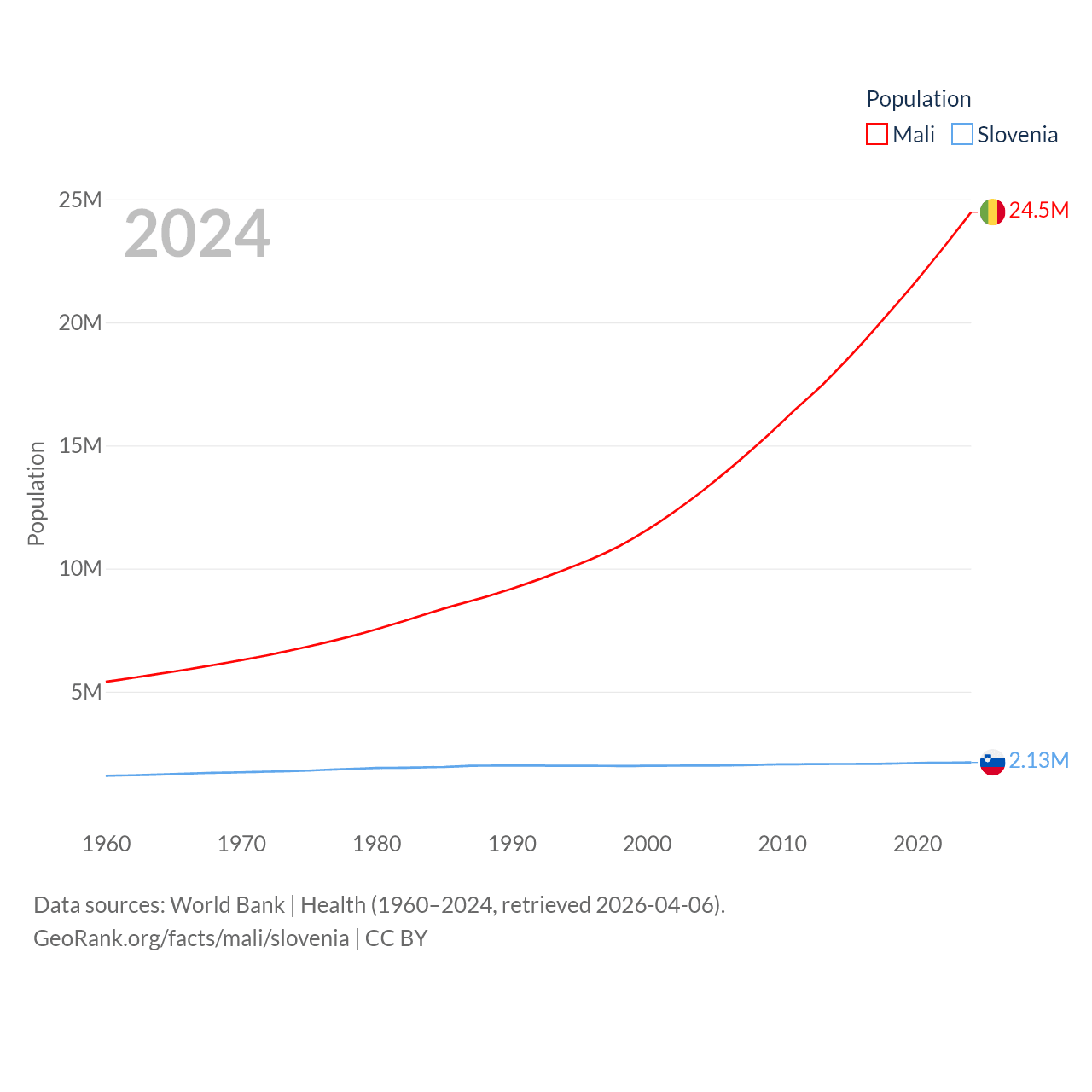 Mali has a population of 24.5M (ranked 58/197), compared with 2.13M in Slovenia (ranked 147/197). Mali's land area is 471,118 sq mi versus 7,774 sq mi for Slovenia (ranked 23rd vs. 151st).