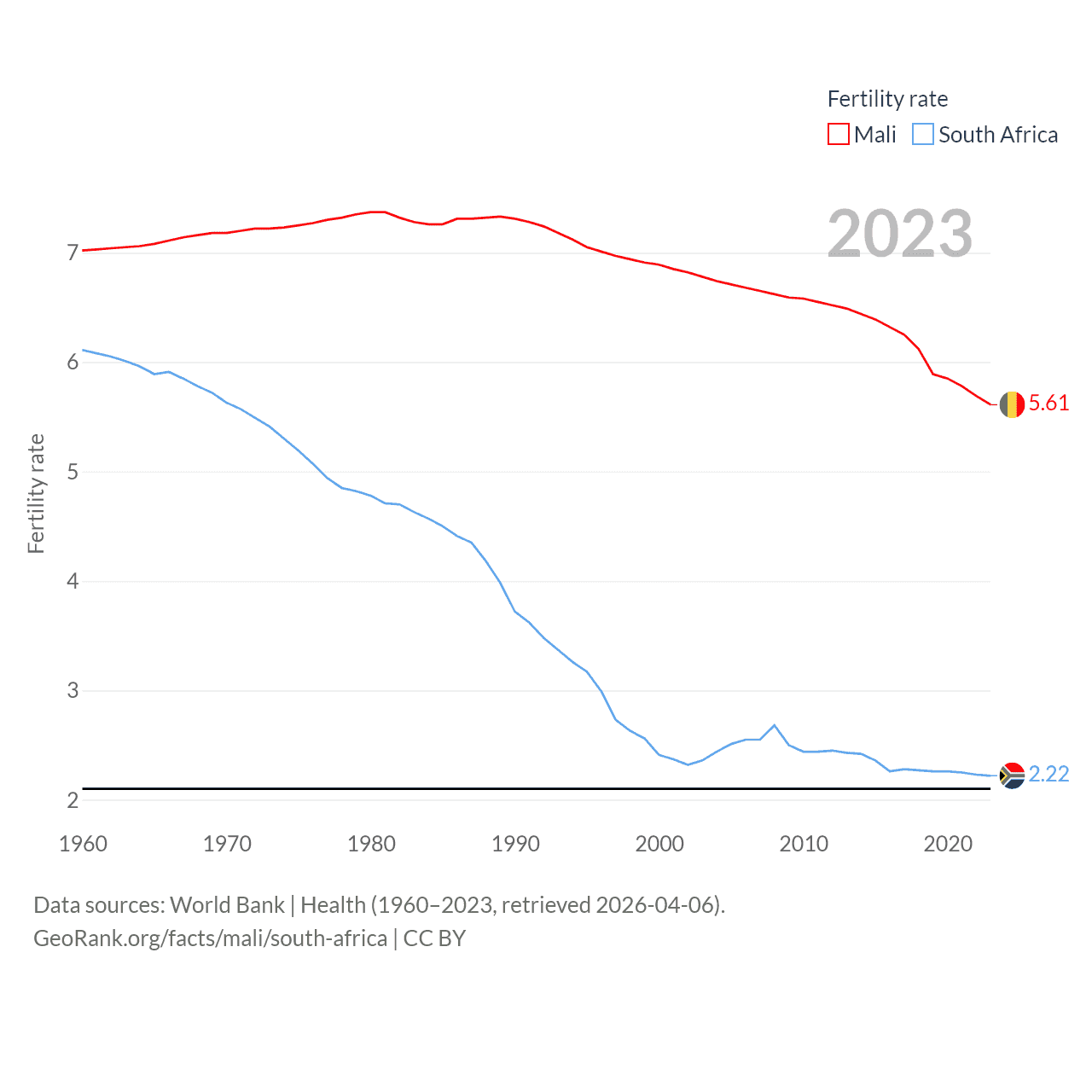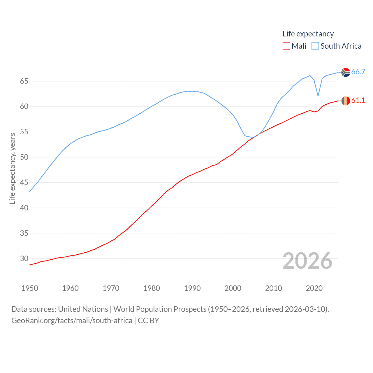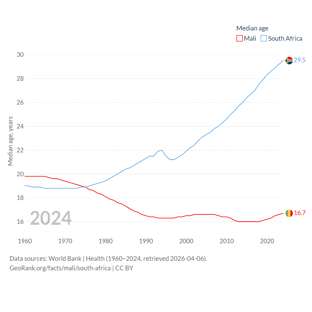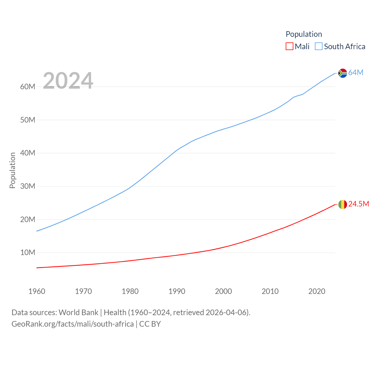 Mali has a population of 24.5M (ranked 58/197), compared with 64M in South Africa (ranked 24/197). Mali's land area is 471,118 sq mi versus 468,377 sq mi for South Africa (ranked 23rd vs. 24th).
