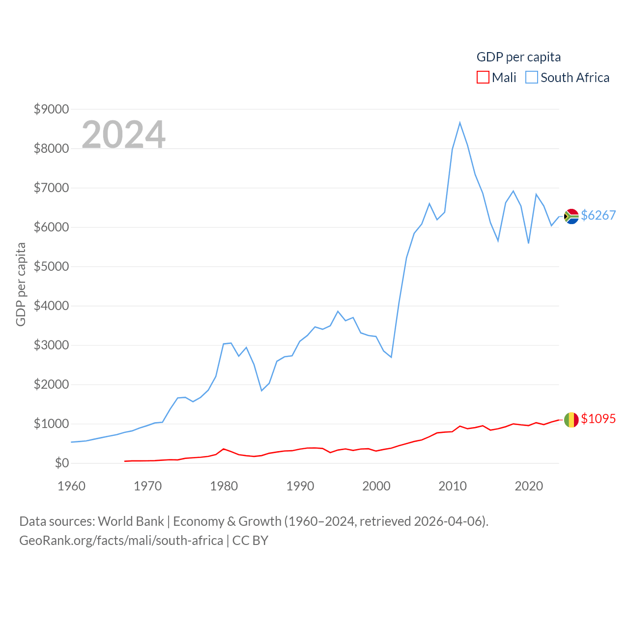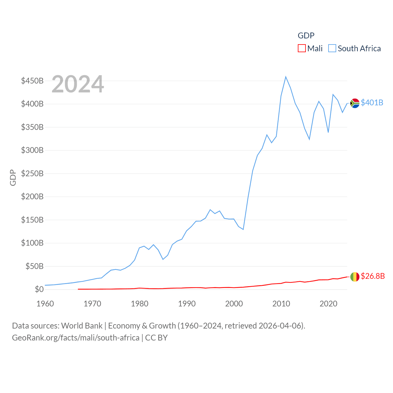 By GDP, Mali ranks 113/197 ($26.8B) and South Africa ranks 40/197 ($401B). By GDP per capita, Mali ranks 173/197 ($1,095), while South Africa ranks 111/197 ($6,267).