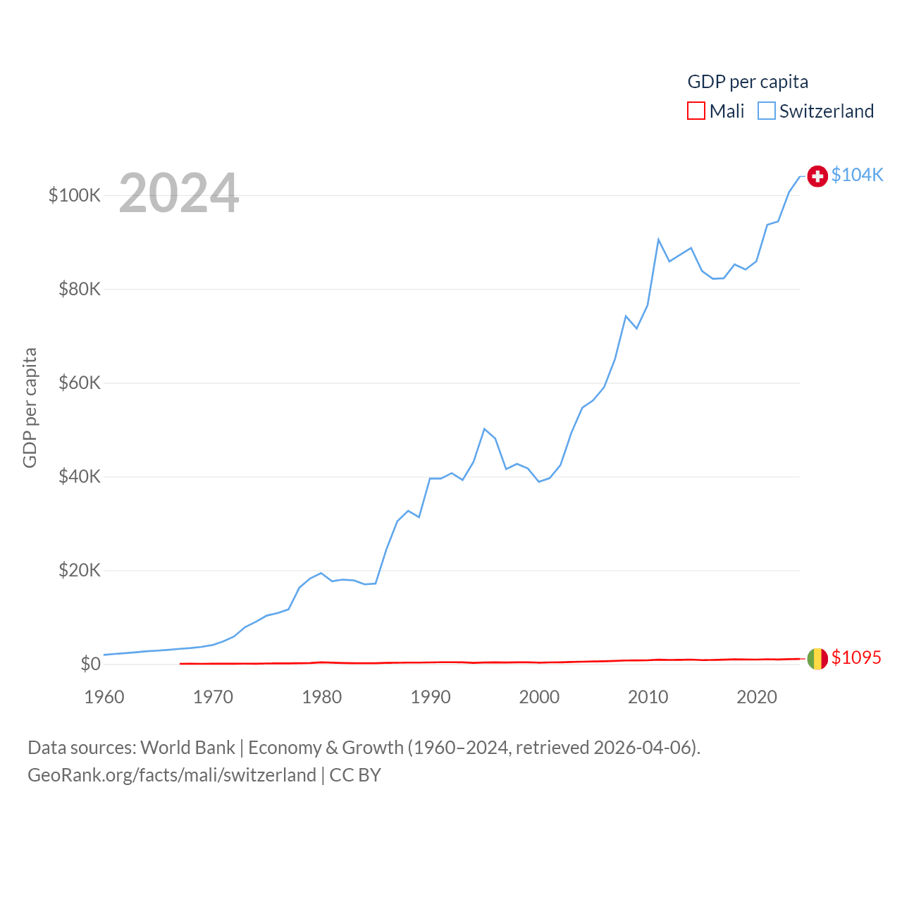 By GDP, Mali ranks 113/197 ($26.8B) and Switzerland ranks 20/197 ($937B). By GDP per capita, Mali ranks 173/197 ($1,095), while Switzerland ranks 5/197 ($103,998).