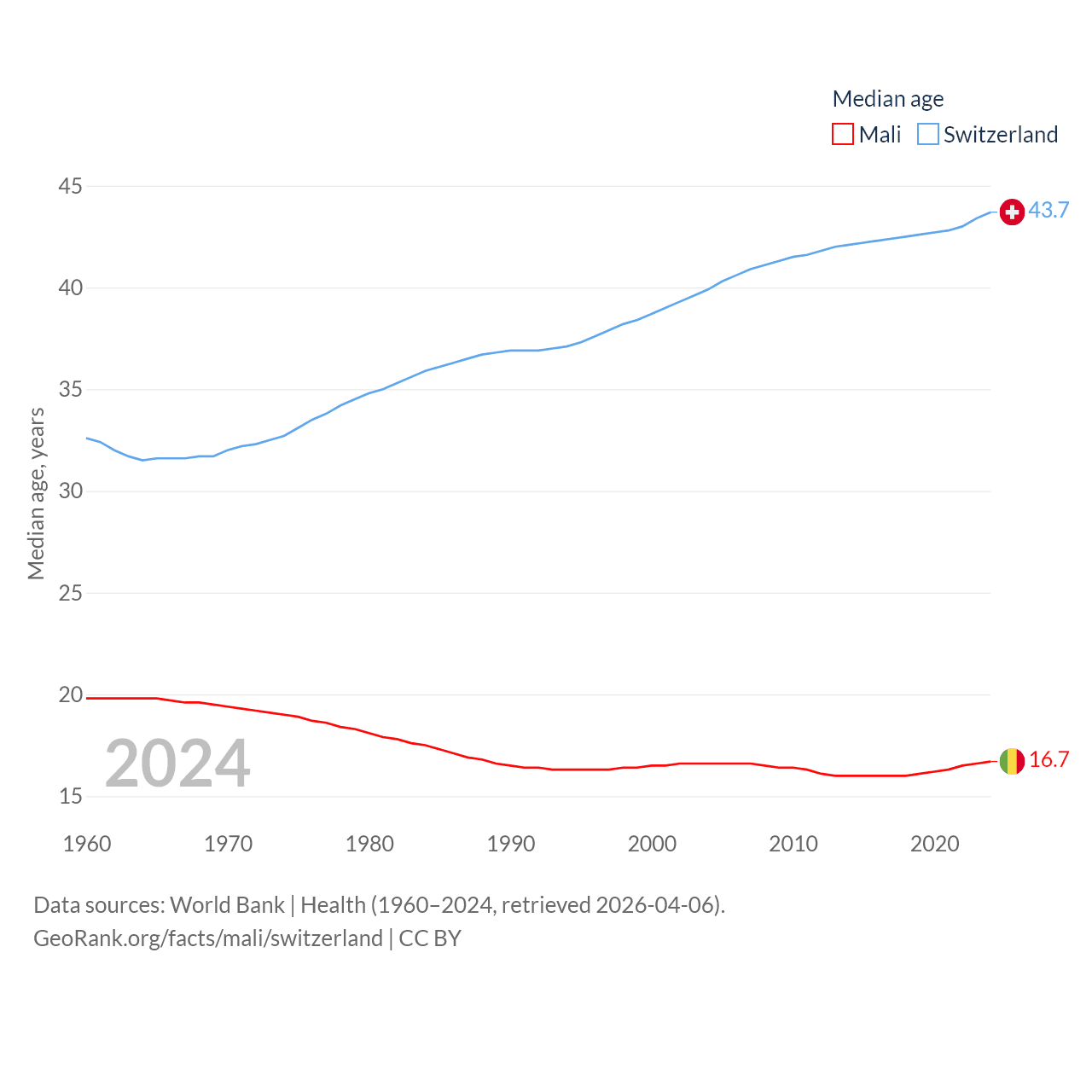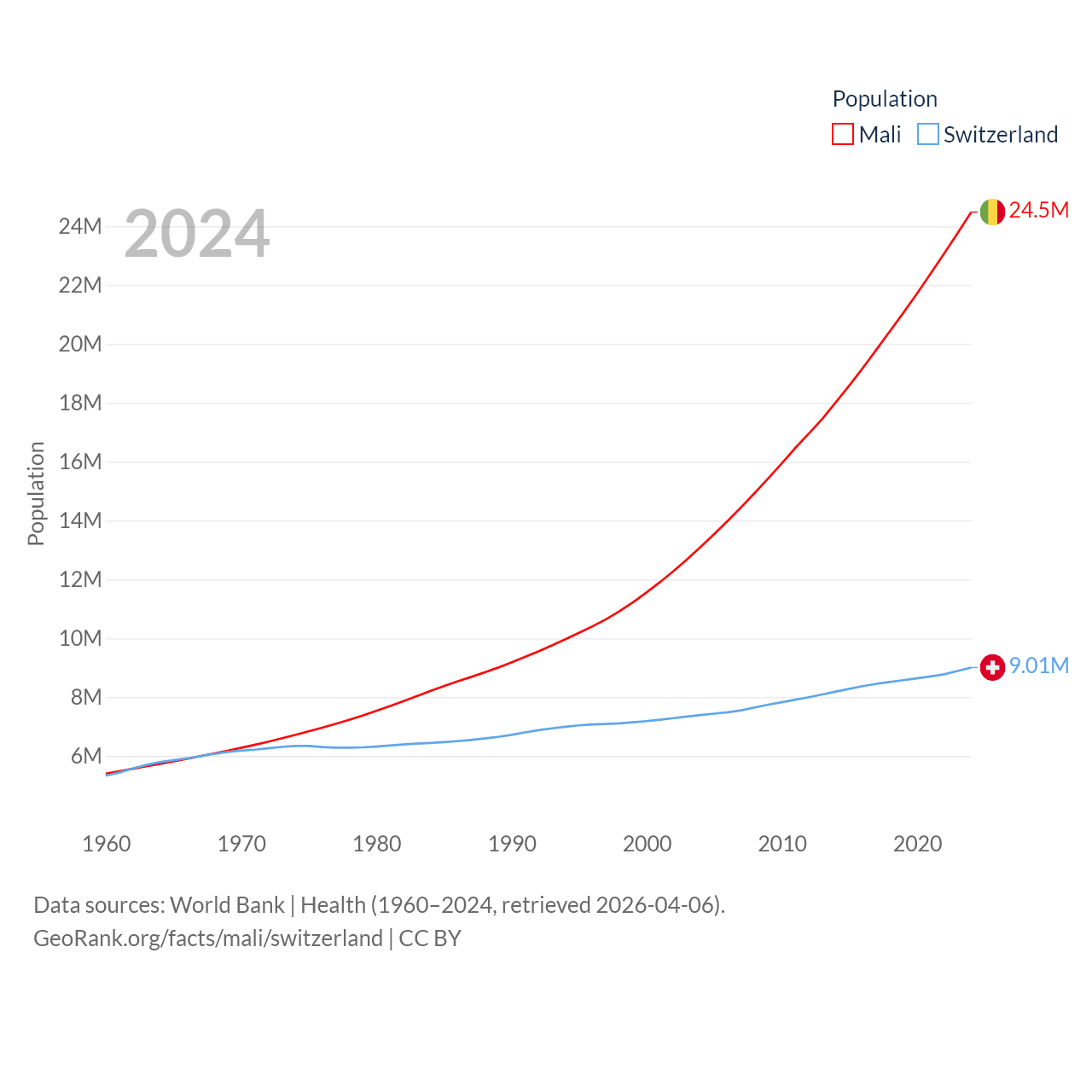 Mali has a population of 24.5M (ranked 58/197), compared with 9.01M in Switzerland (ranked 101/197). Mali's land area is 471,118 sq mi versus 15,255 sq mi for Switzerland (ranked 23rd vs. 131st).
