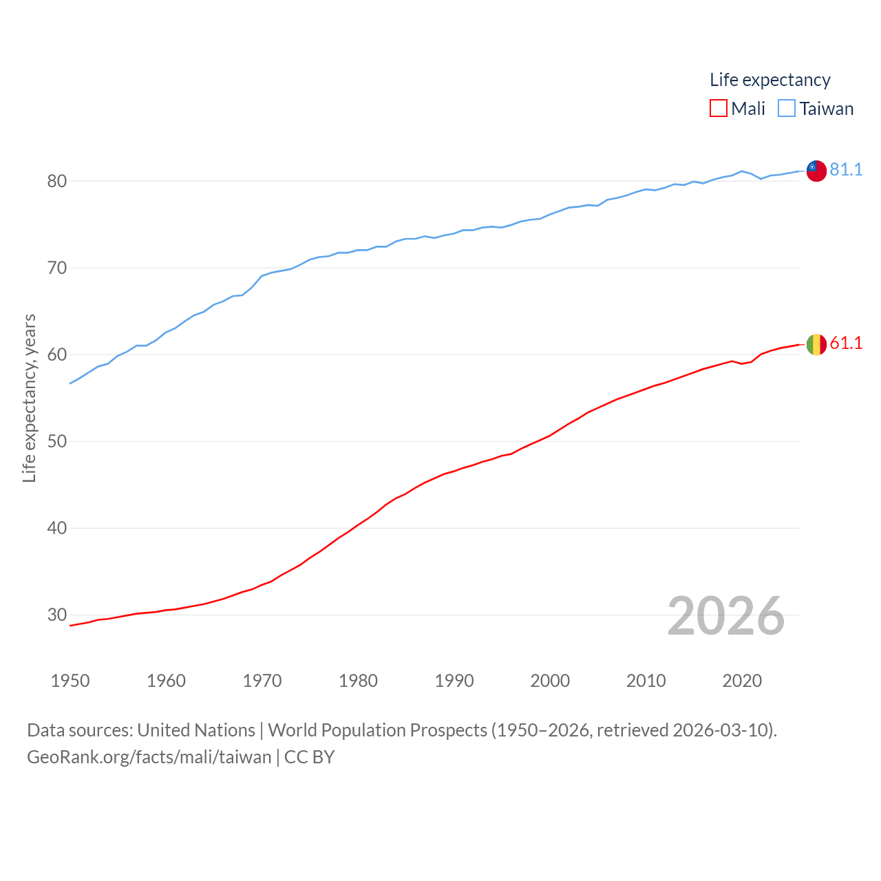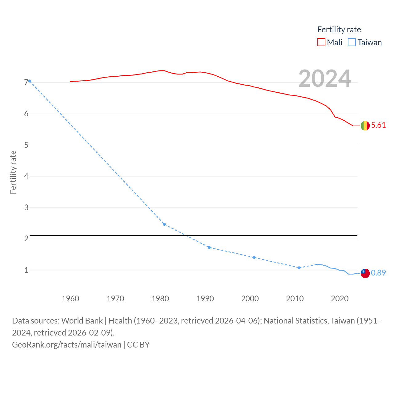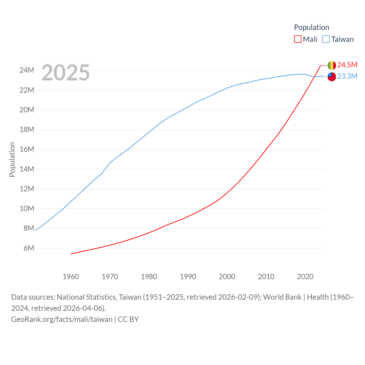 Mali has a population of 24.5M (ranked 58/197), compared with 23.3M in Taiwan (ranked 60/197). Mali's land area is 471,118 sq mi versus 13,976 sq mi for Taiwan (ranked 23rd vs. 133rd).