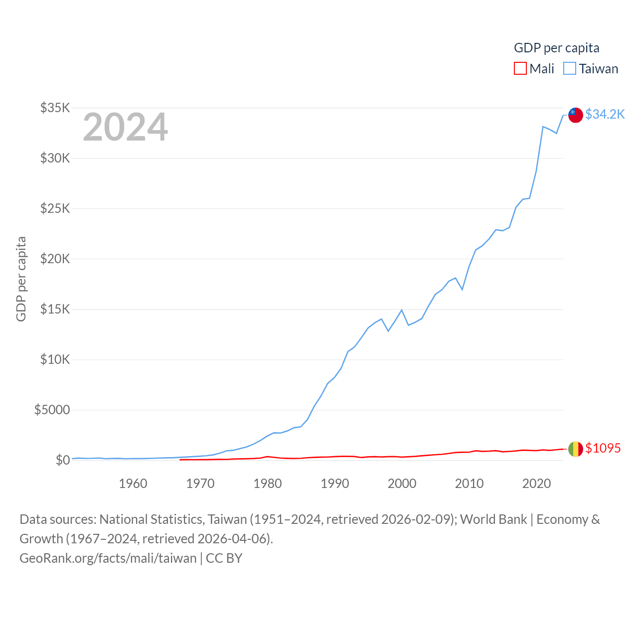 By GDP, Mali ranks 113/197 ($26.8B) and Taiwan ranks 22/197 ($802B). By GDP per capita, Mali ranks 173/197 ($1,095), while Taiwan ranks 35/197 ($34,238).