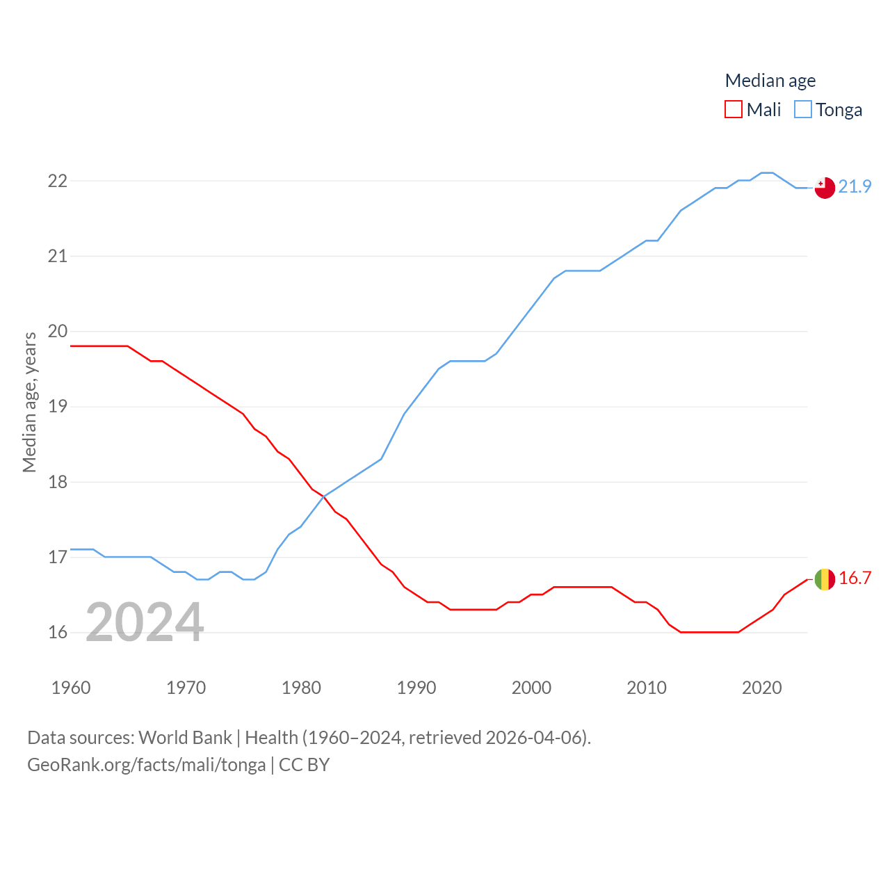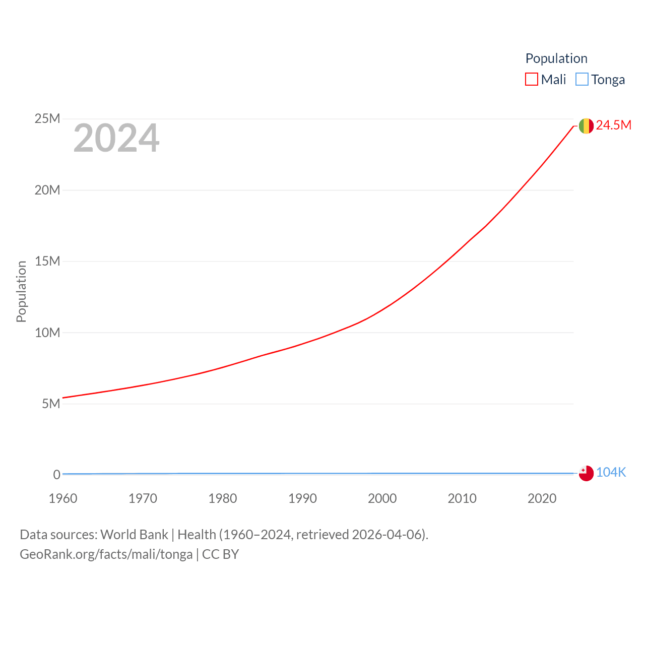 Mali has a population of 24.5M (ranked 58/197), compared with 104K in Tonga (ranked 183/197). Mali's land area is 471,118 sq mi versus 278 sq mi for Tonga (ranked 23rd vs. 176th).