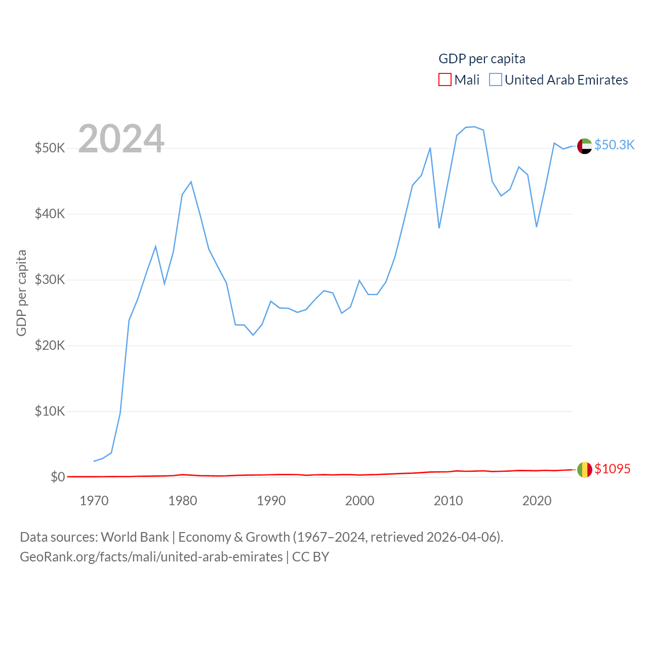 By GDP, Mali ranks 113/197 ($26.8B) and The United Arab Emirates ranks 27/197 ($552B). By GDP per capita, Mali ranks 173/197 ($1,095), while The United Arab Emirates ranks 24/197 ($50,274).