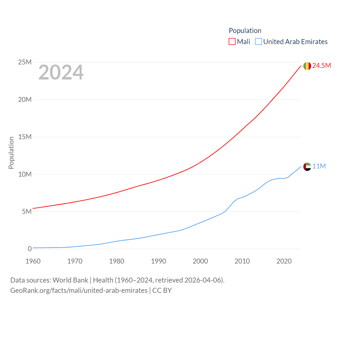 Mali has a population of 24.5M (ranked 58/197), compared with 11M in The United Arab Emirates (ranked 86/197). Mali's land area is 471,118 sq mi versus 27,421 sq mi for The United Arab Emirates (ranked 23rd vs. 117th).