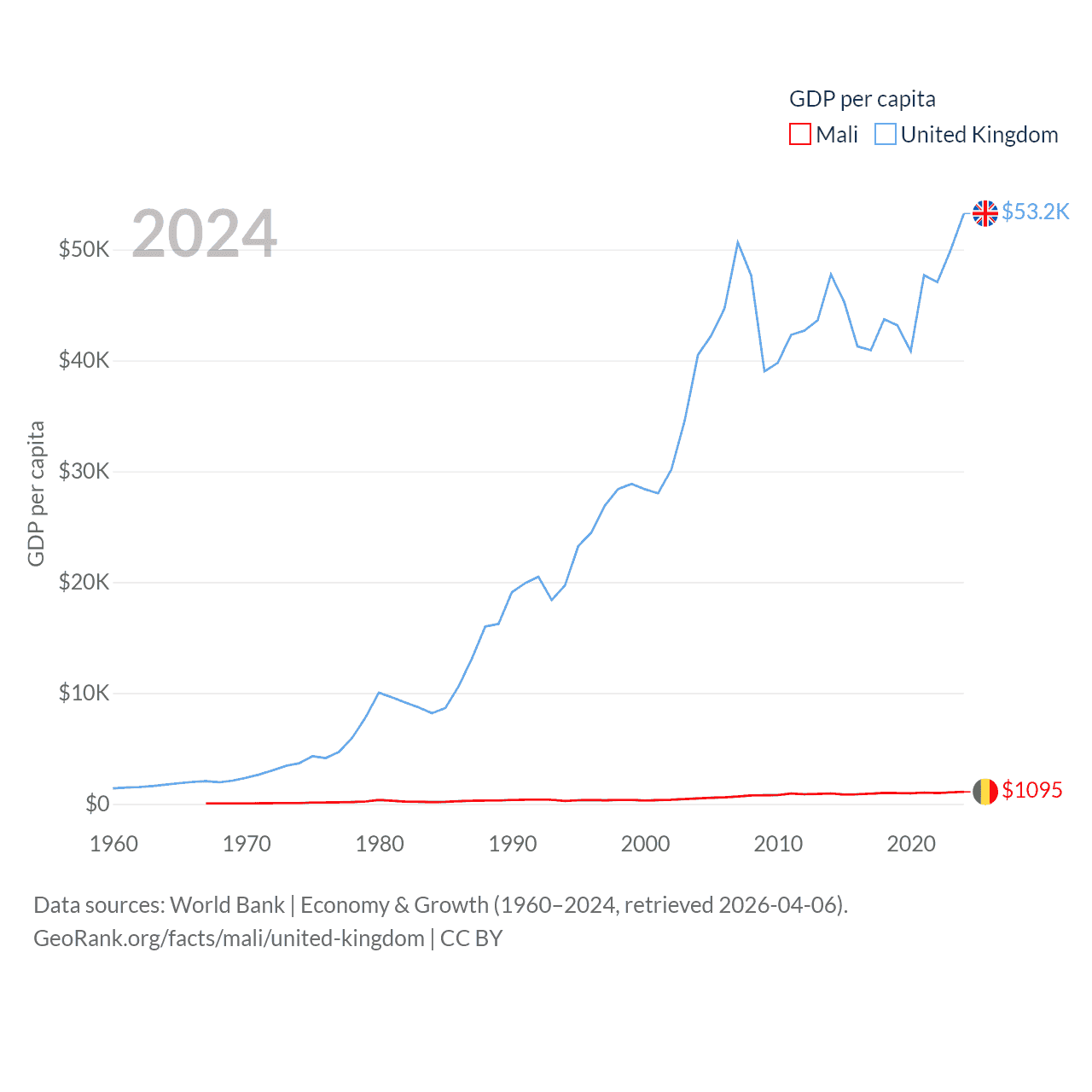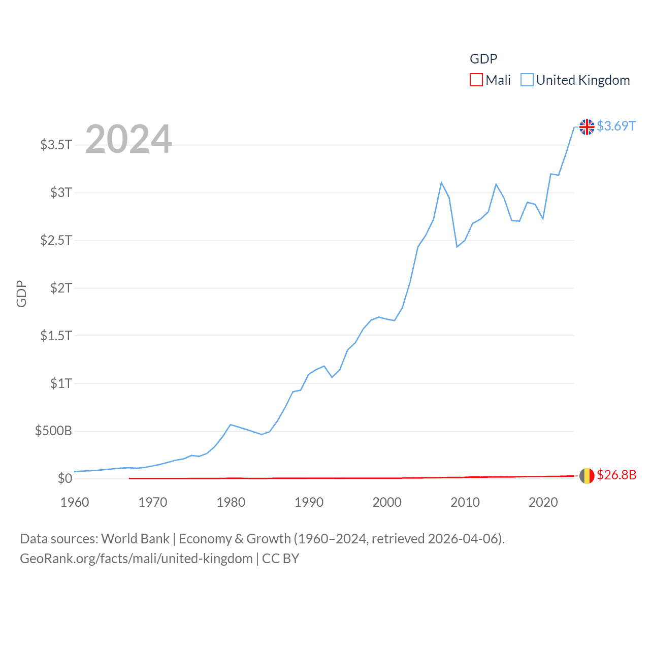 By GDP, Mali ranks 113/197 ($26.8B) and The United Kingdom ranks 6/197 ($3.69T). By GDP per capita, Mali ranks 173/197 ($1,095), while The United Kingdom ranks 22/197 ($53,246).