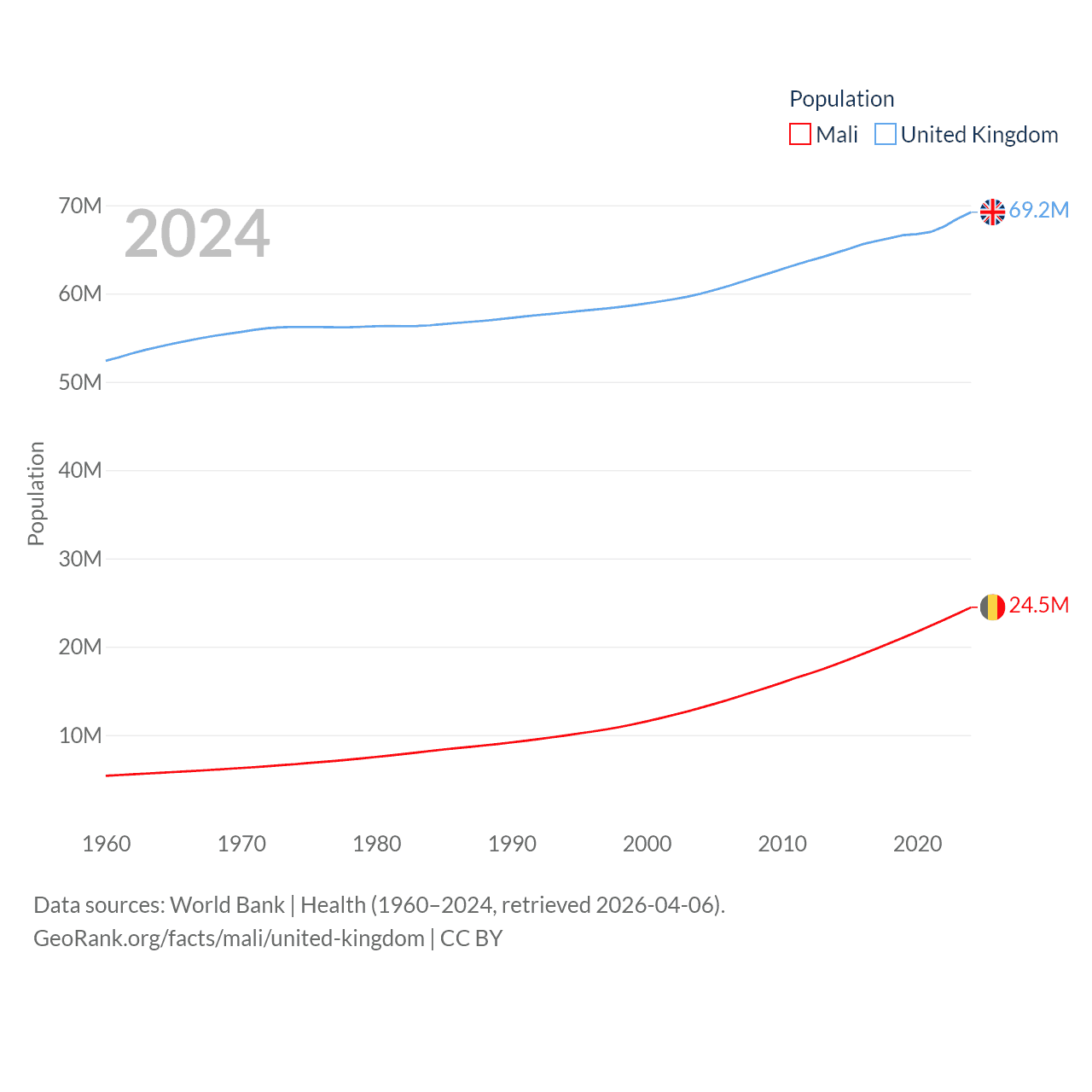 Mali has a population of 24.5M (ranked 58/197), compared with 69.2M in The United Kingdom (ranked 21/197). Mali's land area is 471,118 sq mi versus 93,410 sq mi for The United Kingdom (ranked 23rd vs. 78th).