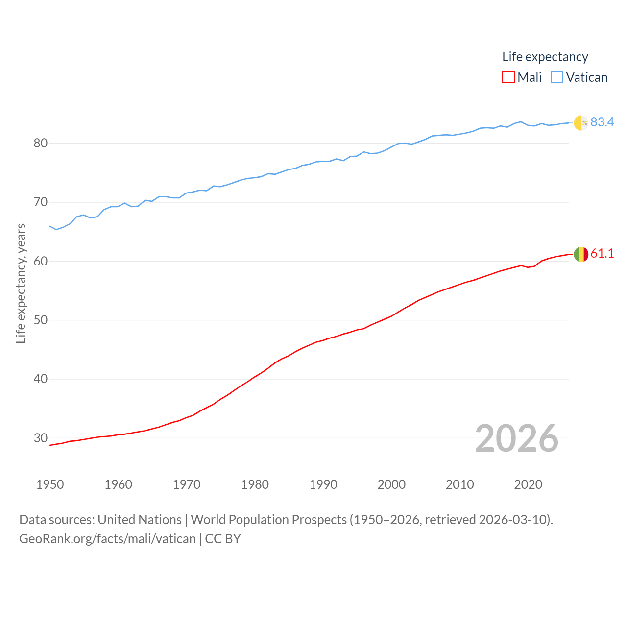 Mali vs. Vatican life expectancy calculator