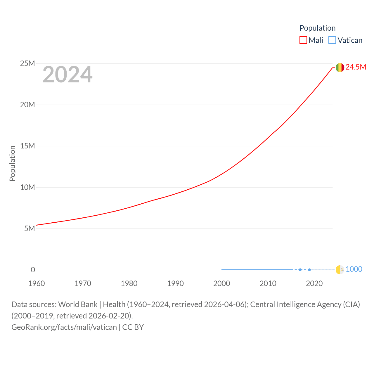 Mali has a population of 24.5M (ranked 58/197), compared with 1K in The Vatican (ranked 197/197). Mali's land area is 471,118 sq mi versus 0.17 sq mi for The Vatican (ranked 23rd vs. 197th).