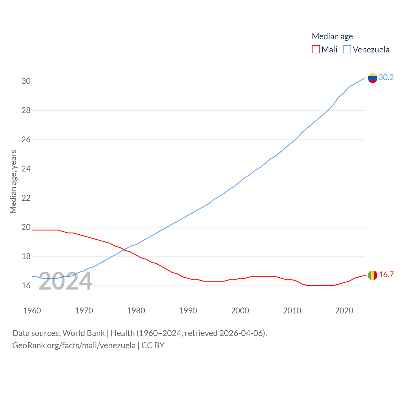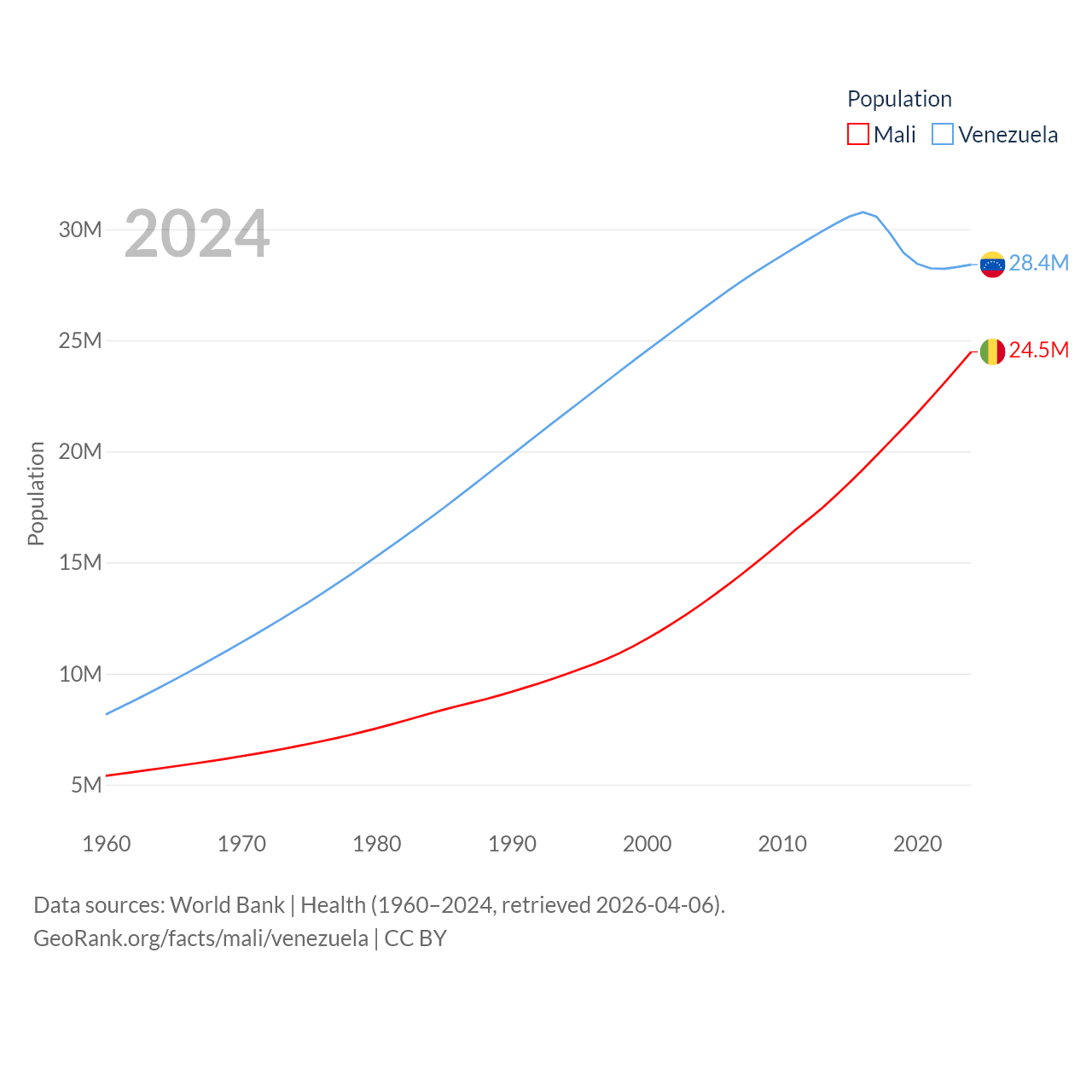 Mali has a population of 24.5M (ranked 58/197), compared with 28.4M in Venezuela (ranked 53/197). Mali's land area is 471,118 sq mi versus 340,561 sq mi for Venezuela (ranked 23rd vs. 32nd).