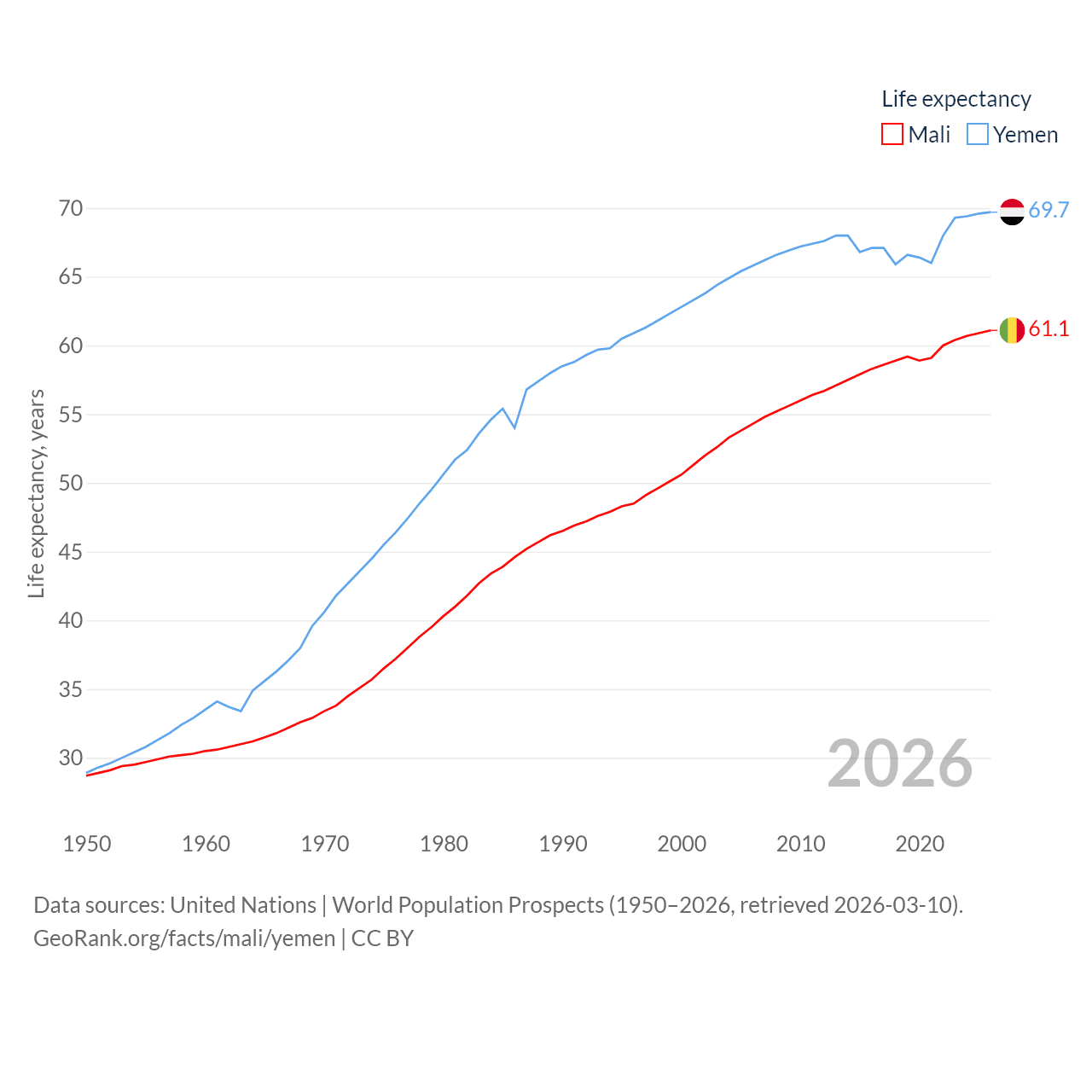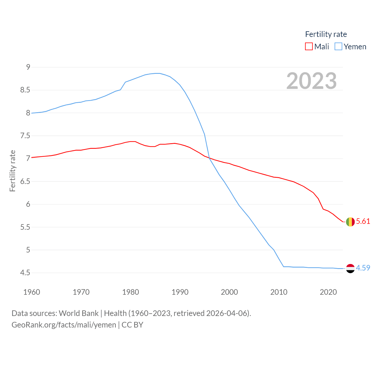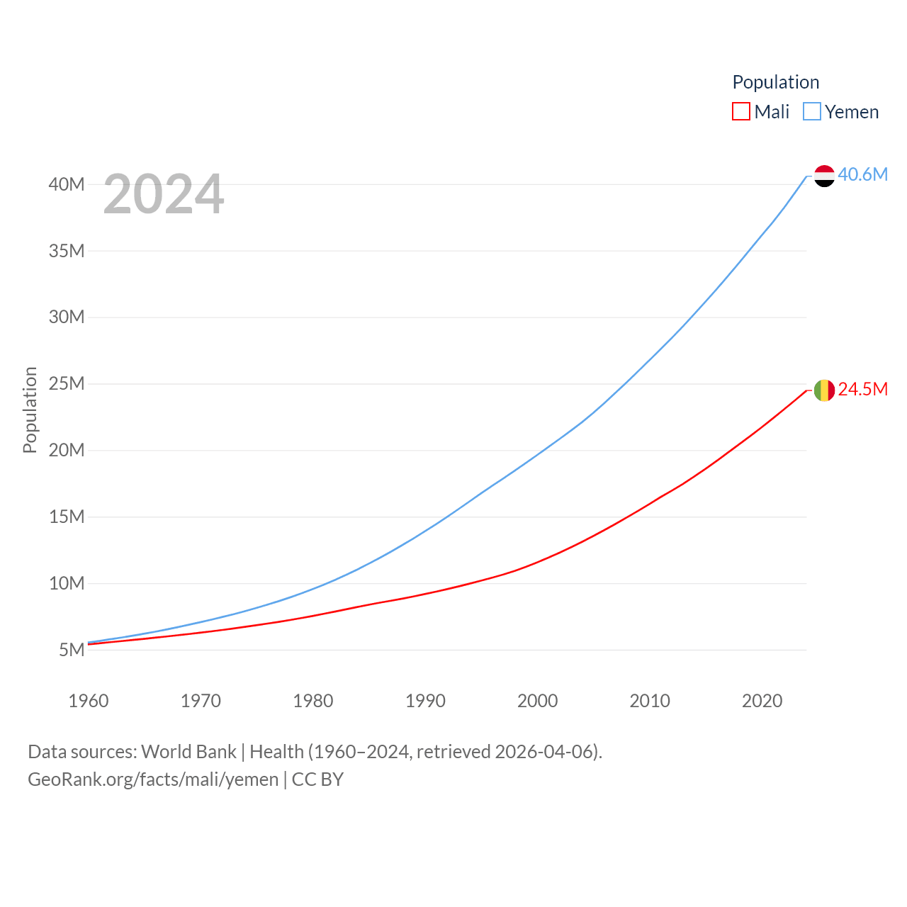 Mali has a population of 24.5M (ranked 58/197), compared with 40.6M in Yemen (ranked 38/197). Mali's land area is 471,118 sq mi versus 203,850 sq mi for Yemen (ranked 23rd vs. 49th).