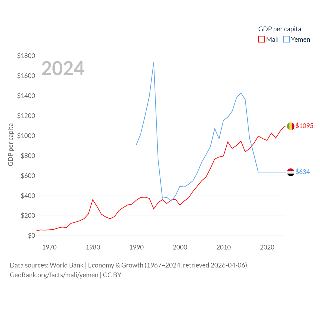 By GDP, Mali ranks 113/197 ($26.8B) and Yemen ranks 125/197 ($21.6B). By GDP per capita, Mali ranks 173/197 ($1,095), while Yemen ranks 191/197 ($634).