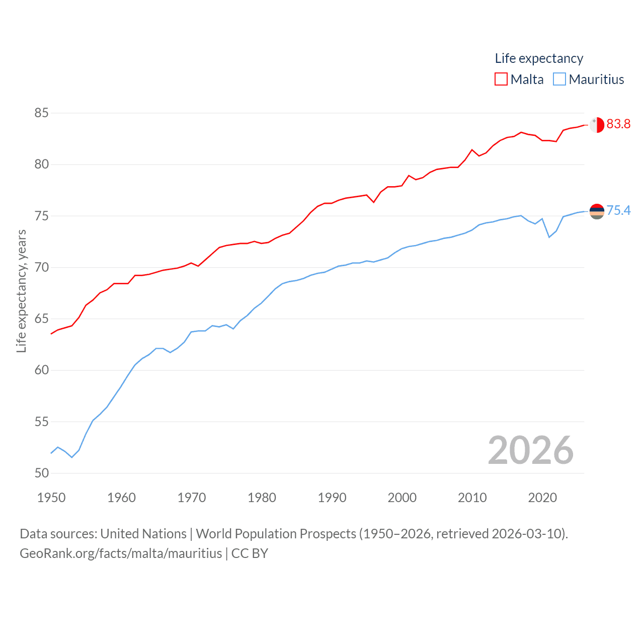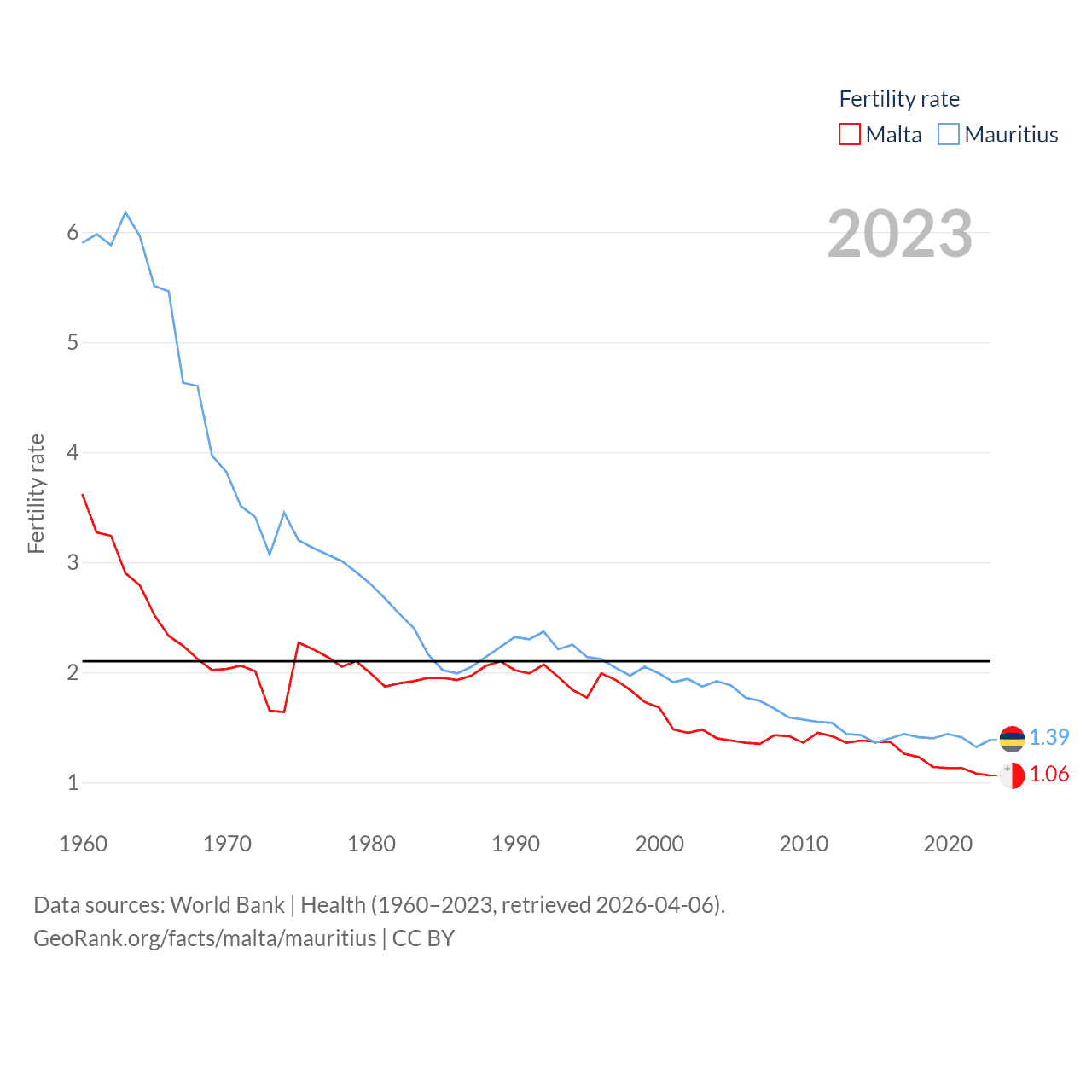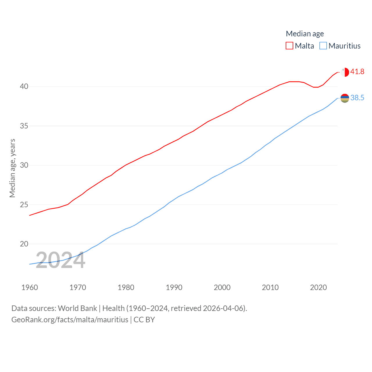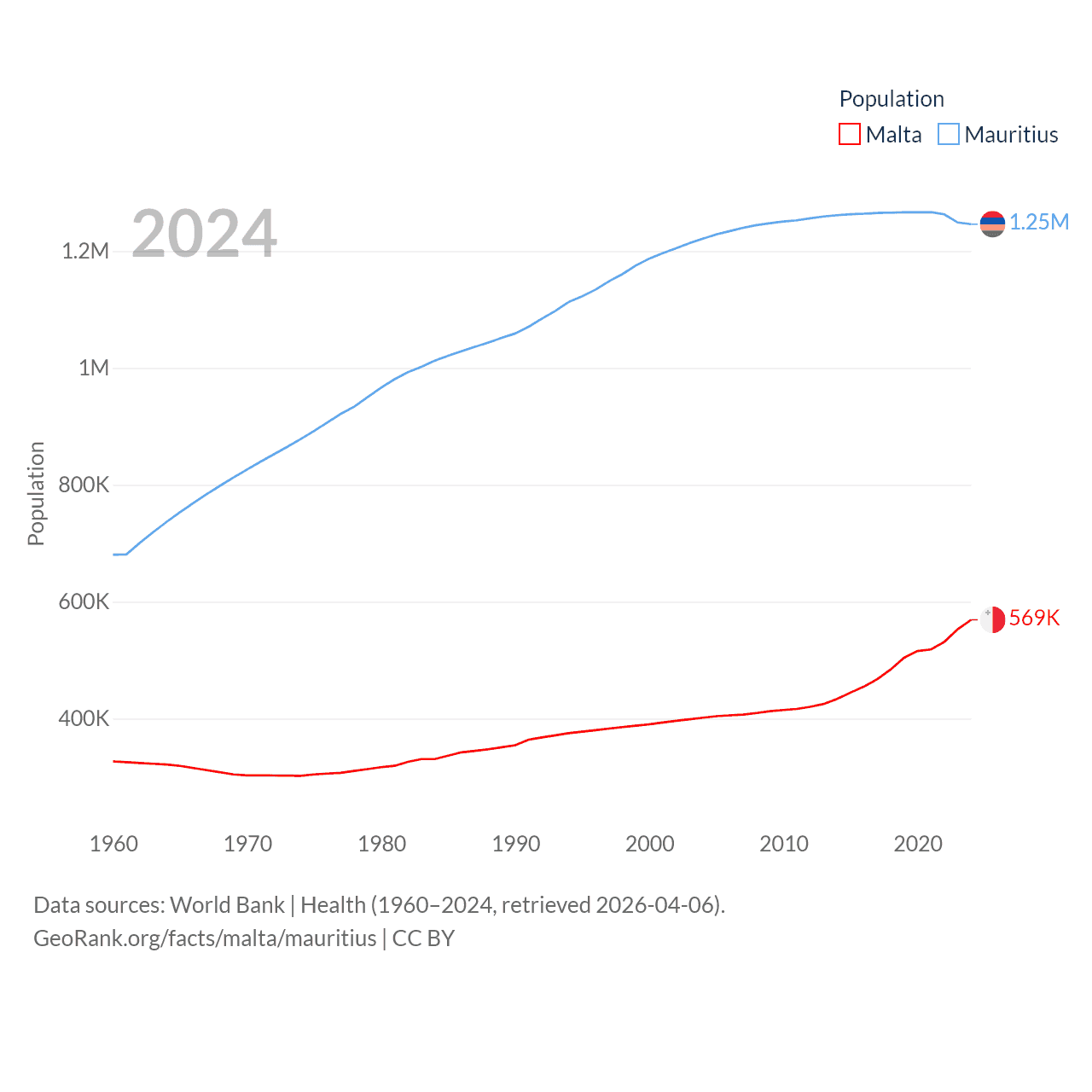 Malta has a population of 569K (ranked 167/197), compared with 1.25M in Mauritius (ranked 156/197). Malta's land area is 123.6 sq mi versus 771 sq mi for Mauritius (ranked 187th vs. 170th).