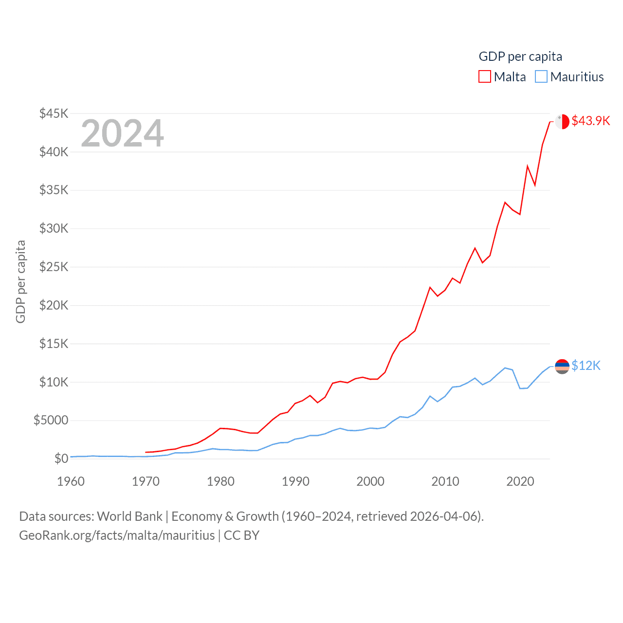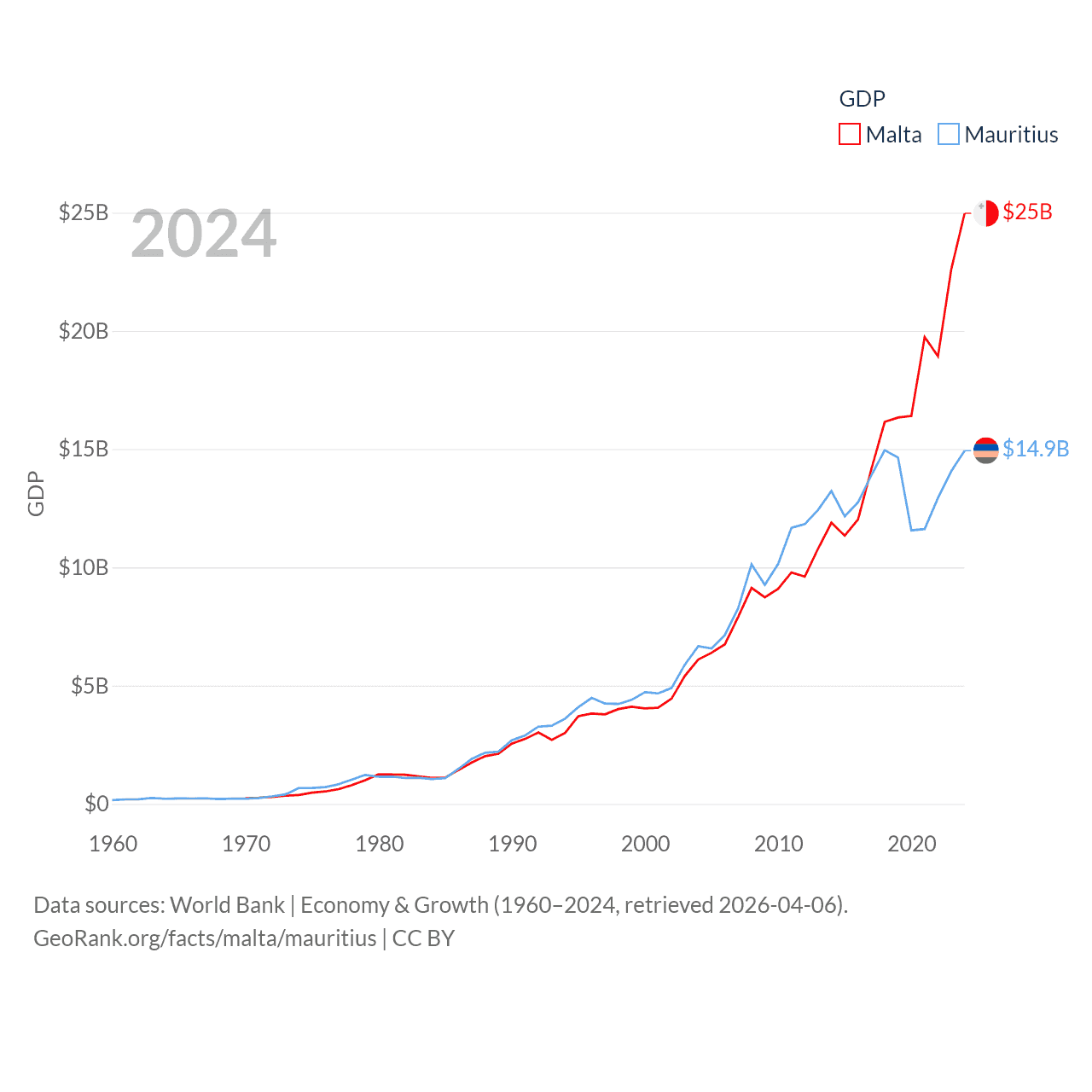 By GDP, Malta ranks 119/197 ($25B) and Mauritius ranks 143/197 ($14.9B). By GDP per capita, Malta ranks 28/197 ($43,899), while Mauritius ranks 78/197 ($11,991).