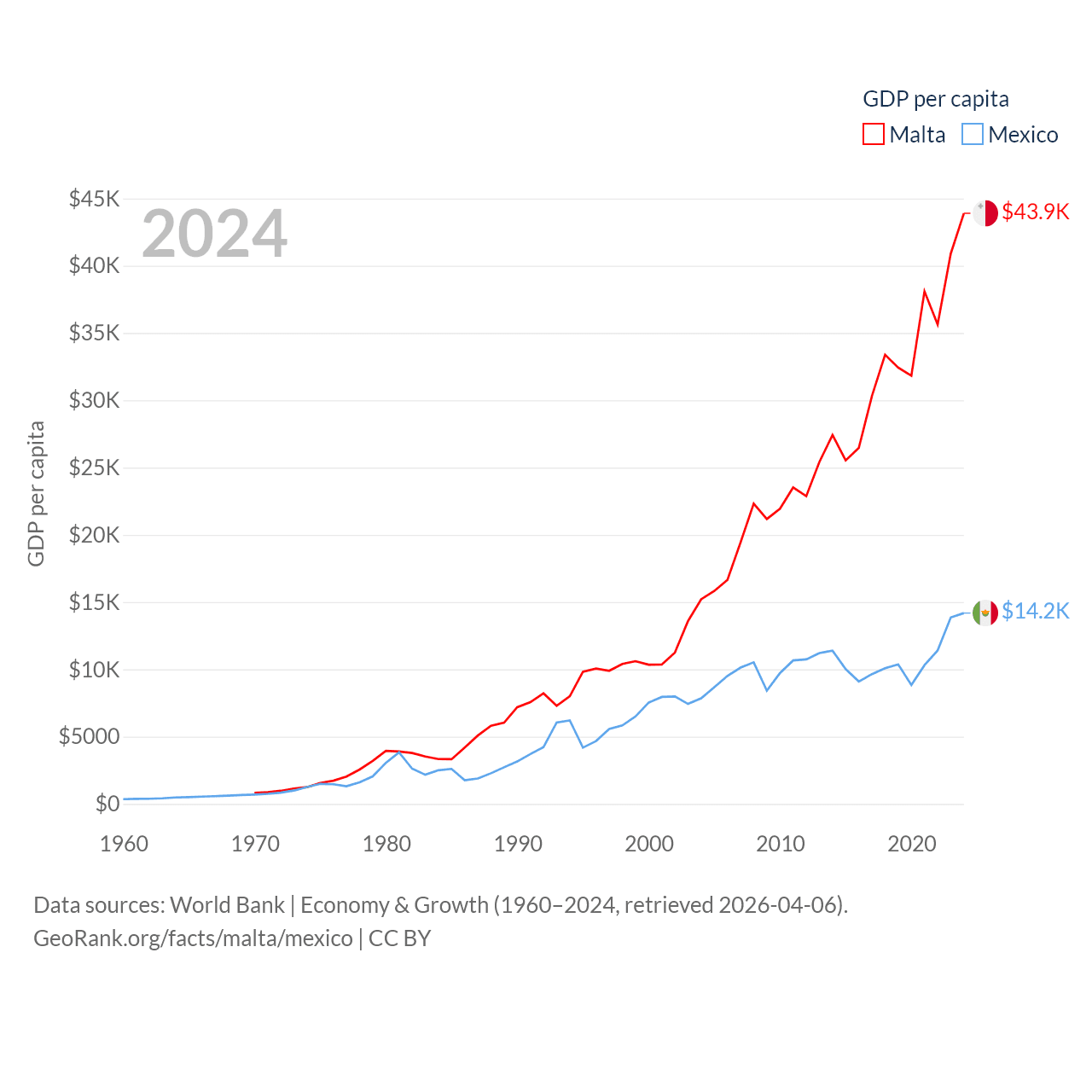 By GDP, Malta ranks 119/197 ($25B) and Mexico ranks 13/197 ($1.86T). By GDP per capita, Malta ranks 28/197 ($43,899), while Mexico ranks 69/197 ($14,186).