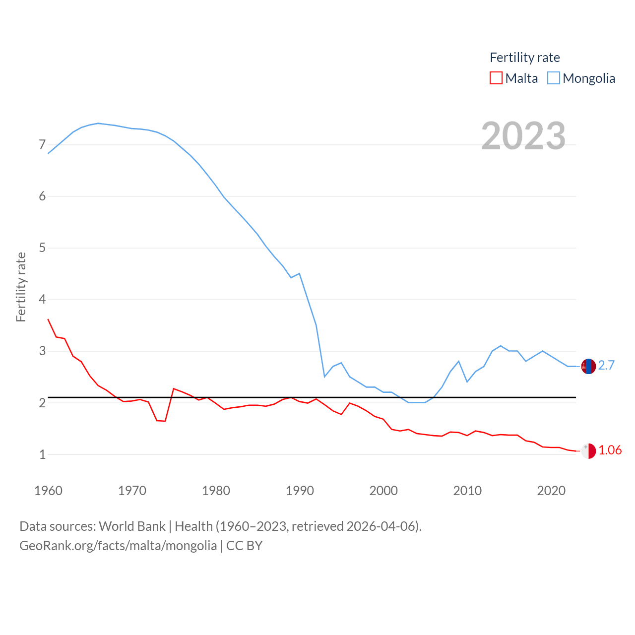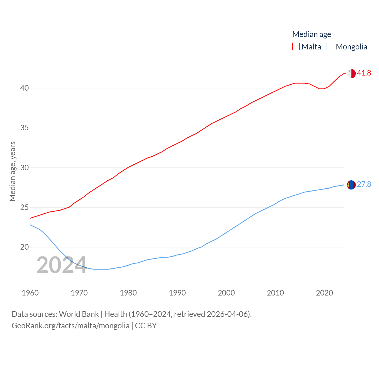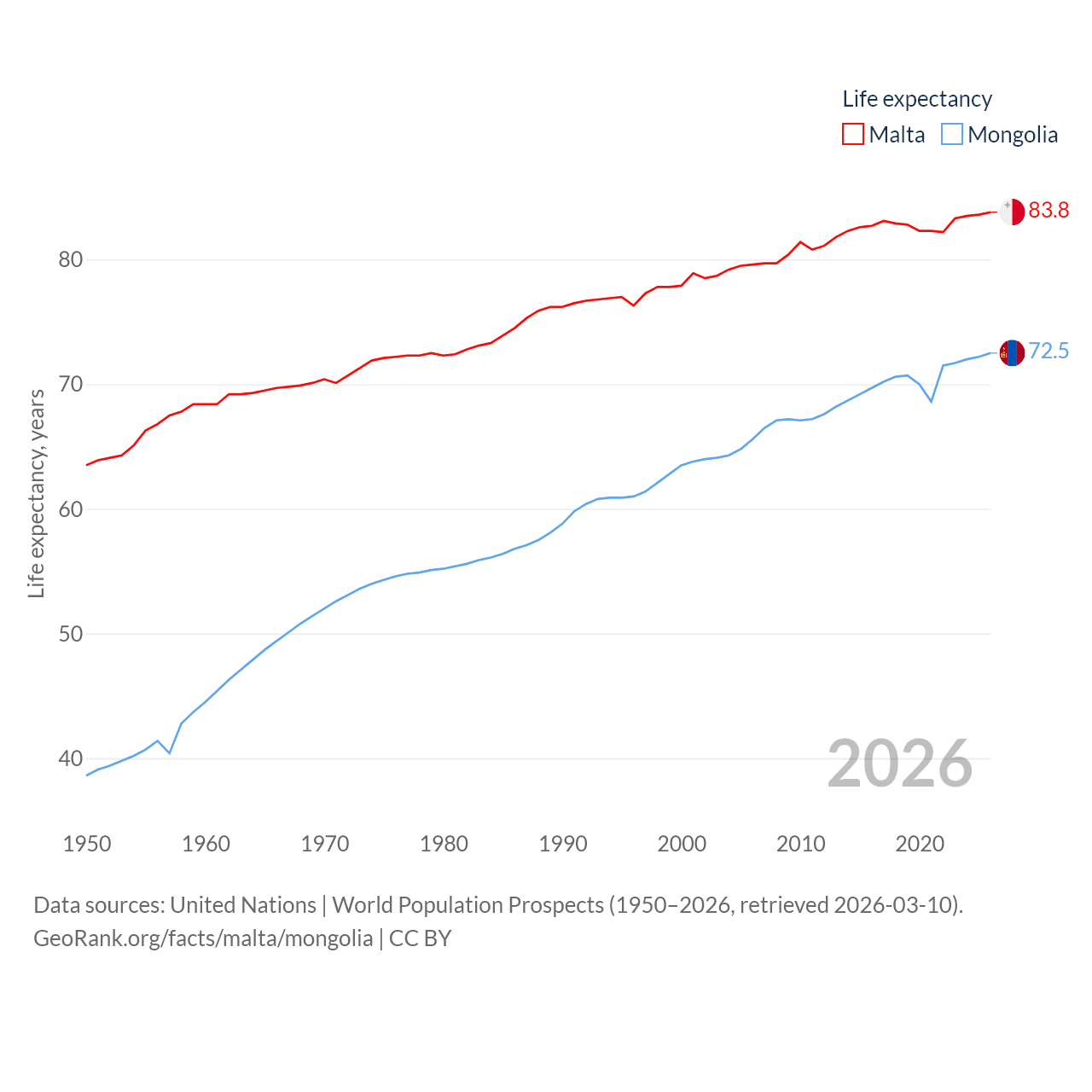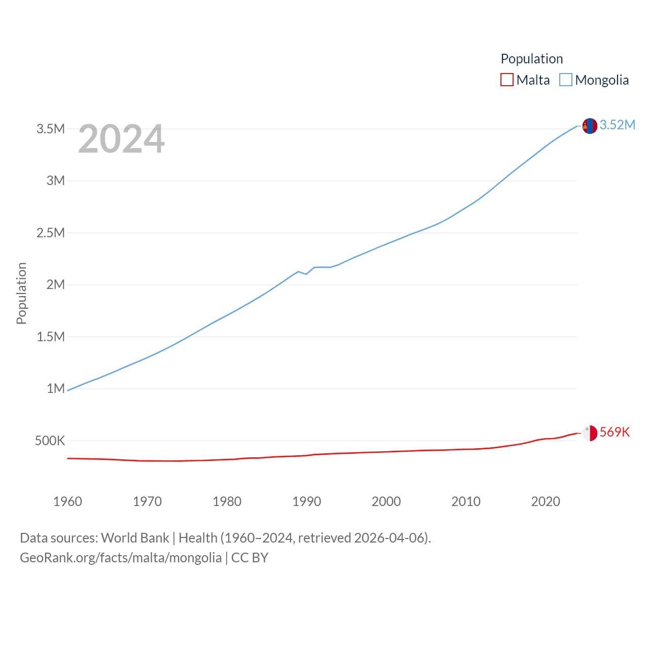 Malta has a population of 569K (ranked 167/197), compared with 3.52M in Mongolia (ranked 132/197). Malta's land area is 123.6 sq mi versus 601,740 sq mi for Mongolia (ranked 187th vs. 18th).