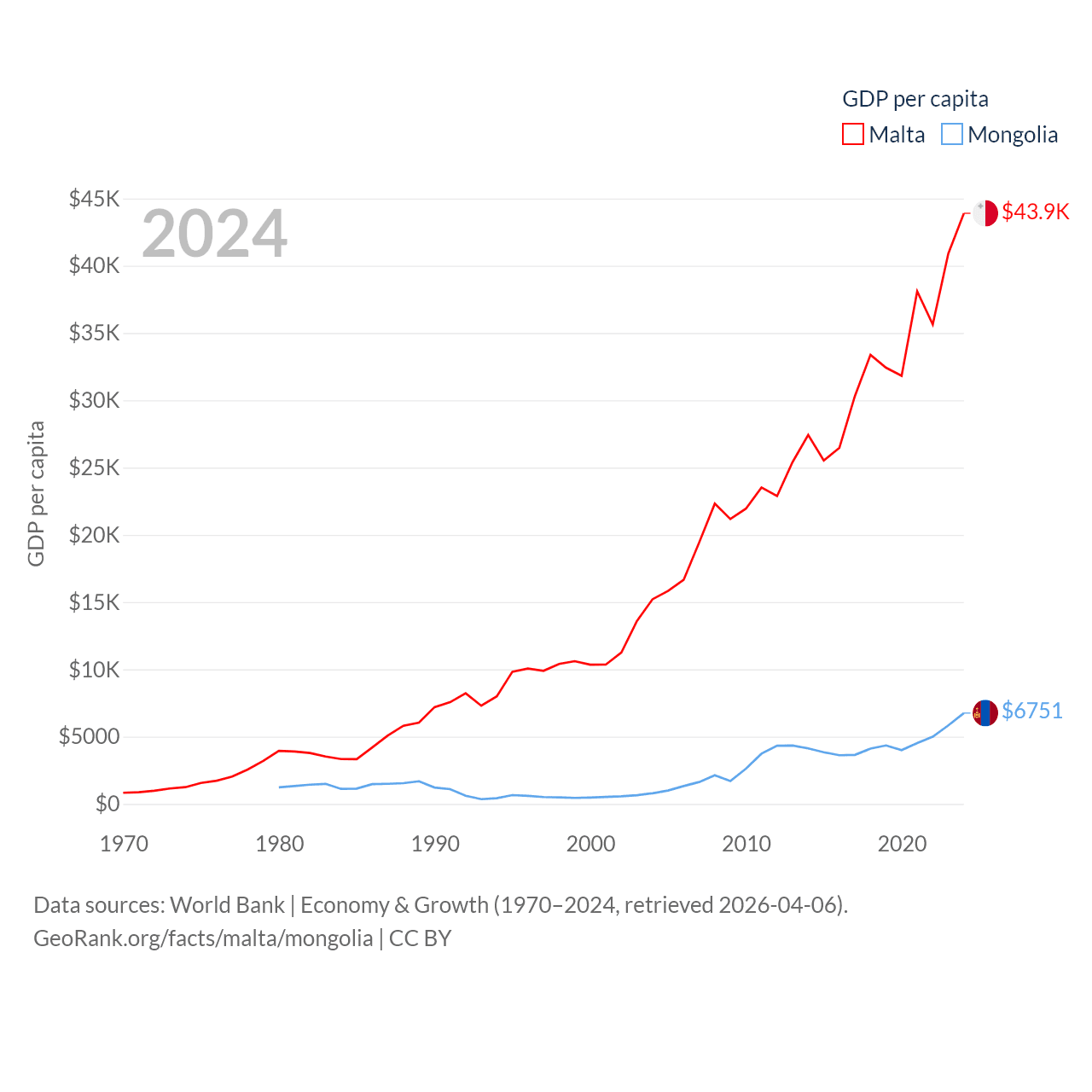 By GDP, Malta ranks 119/197 ($25B) and Mongolia ranks 121/197 ($23.8B). By GDP per capita, Malta ranks 28/197 ($43,899), while Mongolia ranks 105/197 ($6,751).