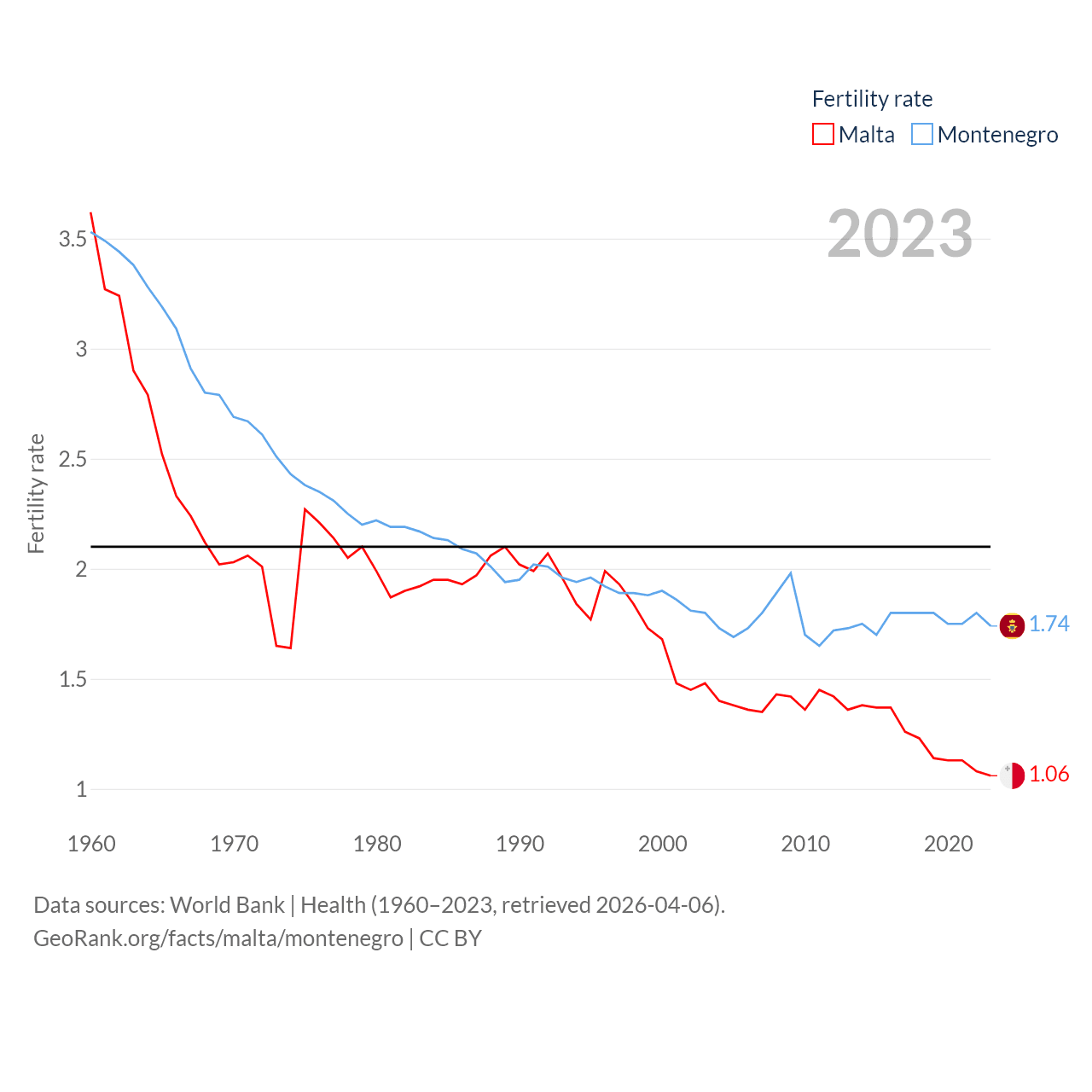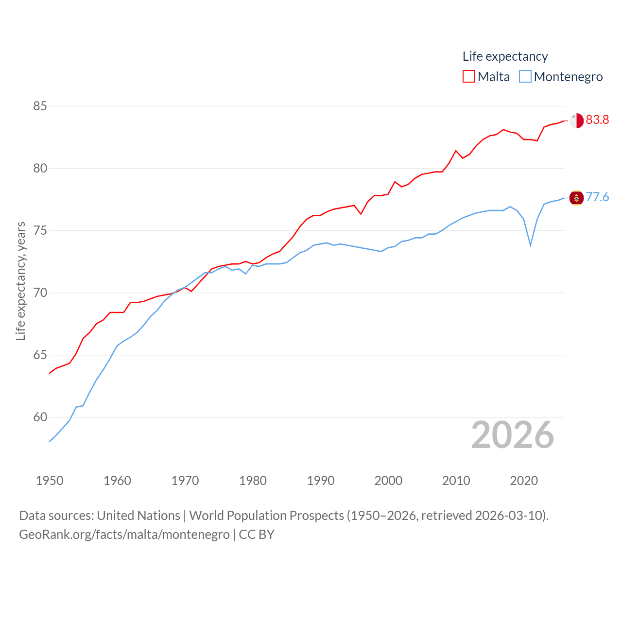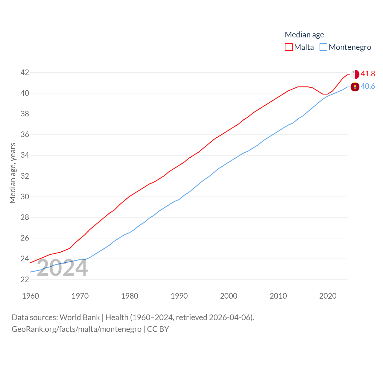 Malta has a population of 569K (ranked 167/197), compared with 624K in Montenegro (ranked 166/197). Malta's land area is 123.6 sq mi versus 5,193 sq mi for Montenegro (ranked 187th vs. 156th).