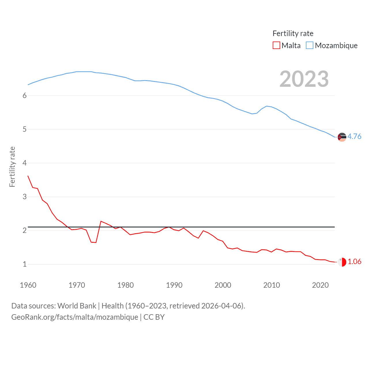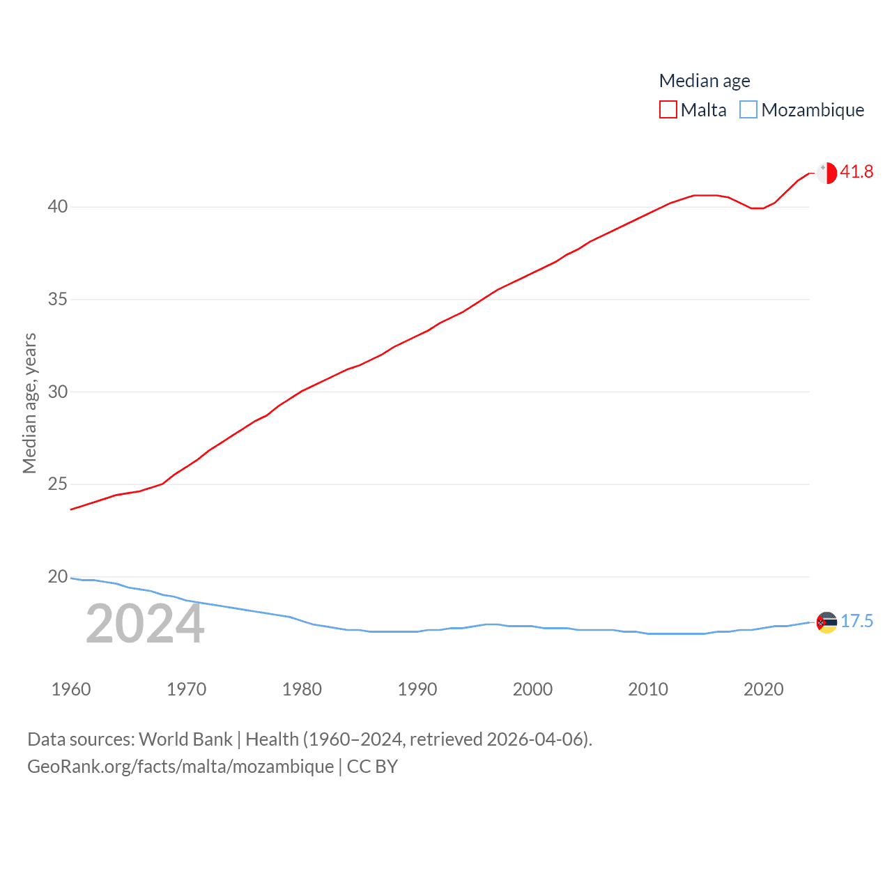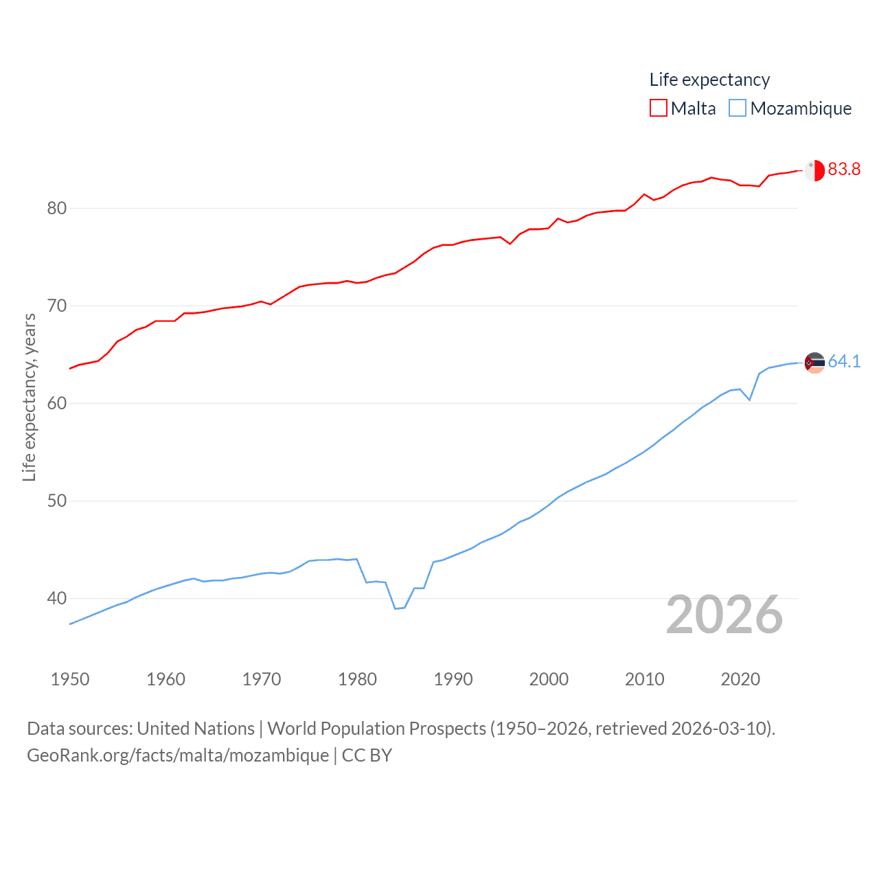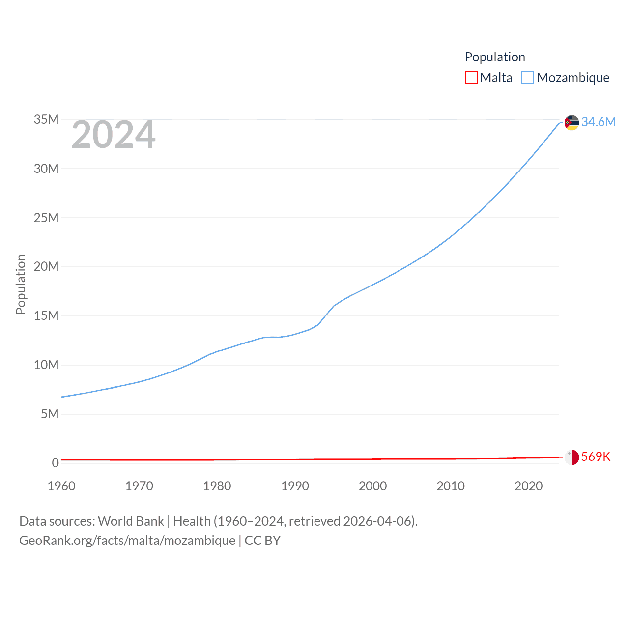 Malta has a population of 569K (ranked 167/197), compared with 34.6M in Mozambique (ranked 46/197). Malta's land area is 123.6 sq mi versus 303,623 sq mi for Mozambique (ranked 187th vs. 34th).
