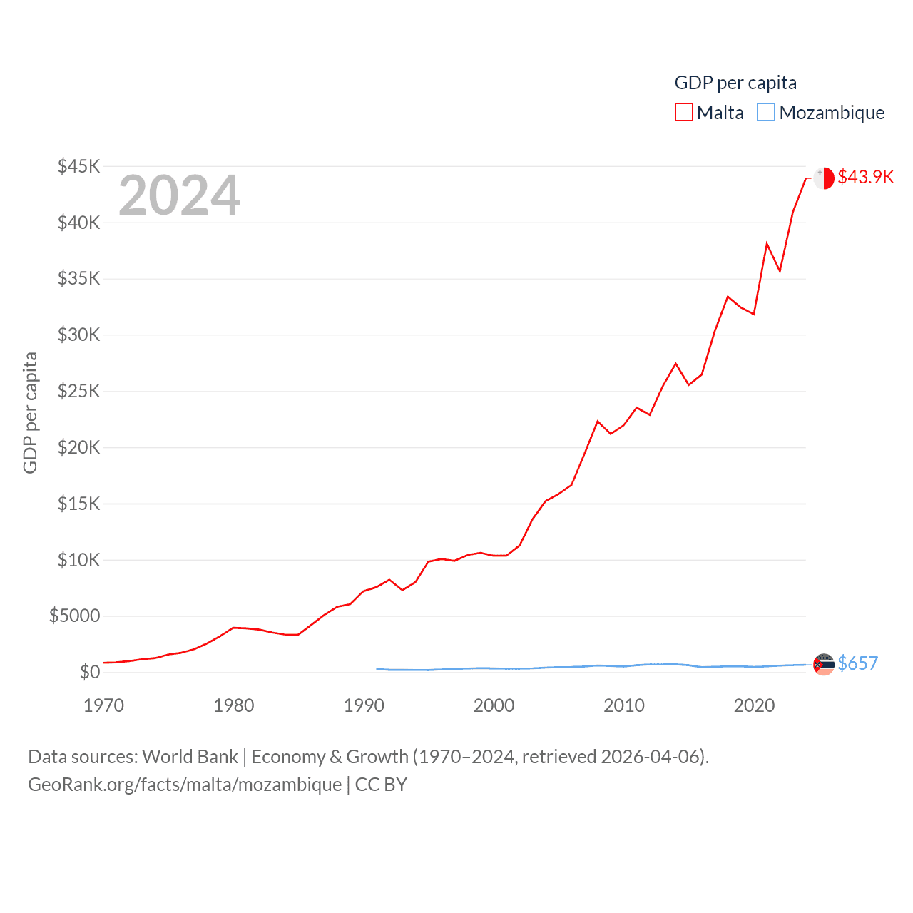 By GDP, Malta ranks 119/197 ($25B) and Mozambique ranks 123/197 ($22.7B). By GDP per capita, Malta ranks 28/197 ($43,899), while Mozambique ranks 189/197 ($657).