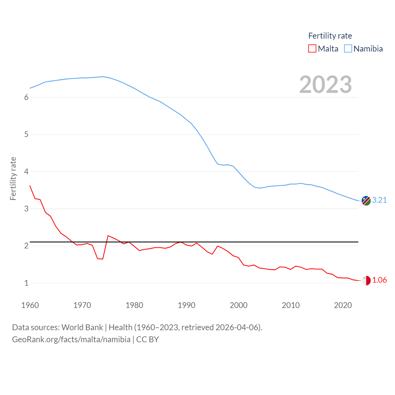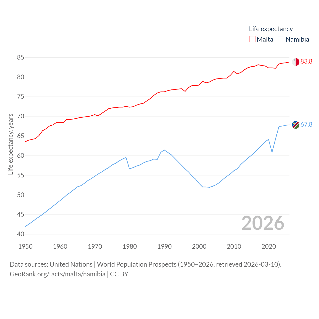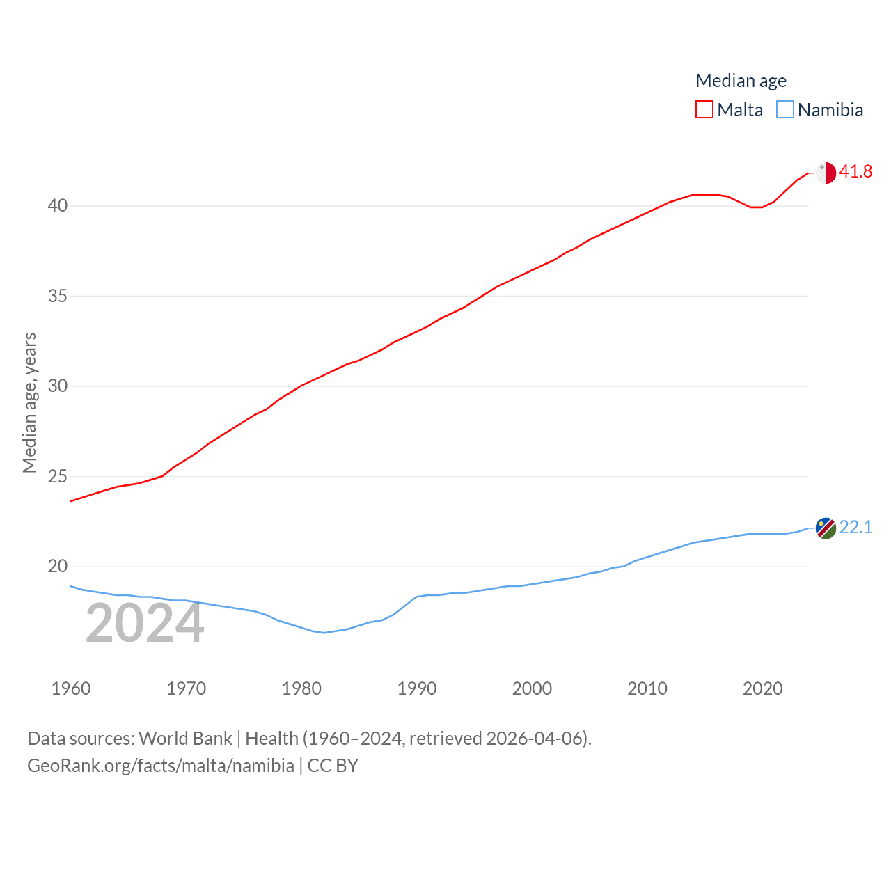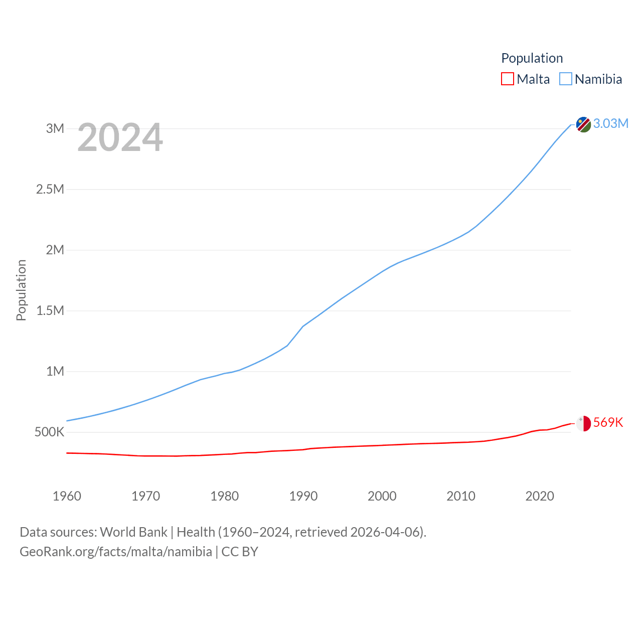 Malta has a population of 569K (ranked 167/197), compared with 3.03M in Namibia (ranked 136/197). Malta's land area is 123.6 sq mi versus 317,874 sq mi for Namibia (ranked 187th vs. 33rd).