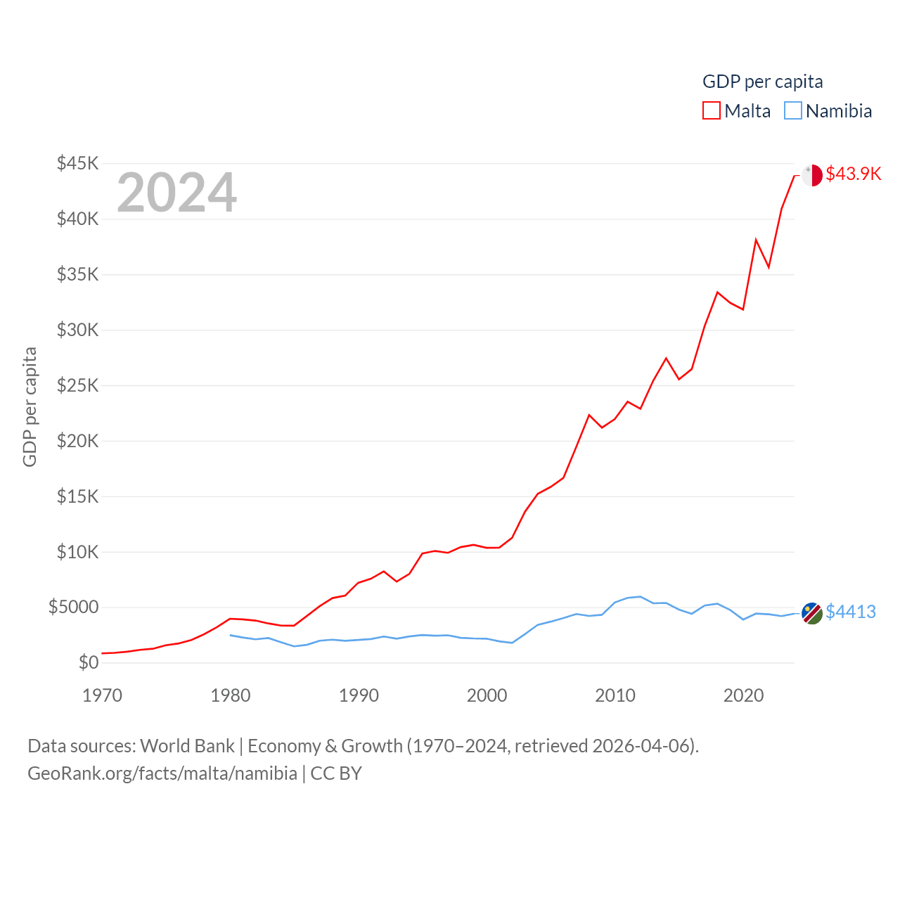 By GDP, Malta ranks 119/197 ($25B) and Namibia ranks 147/197 ($13.4B). By GDP per capita, Malta ranks 28/197 ($43,899), while Namibia ranks 126/197 ($4,413).
