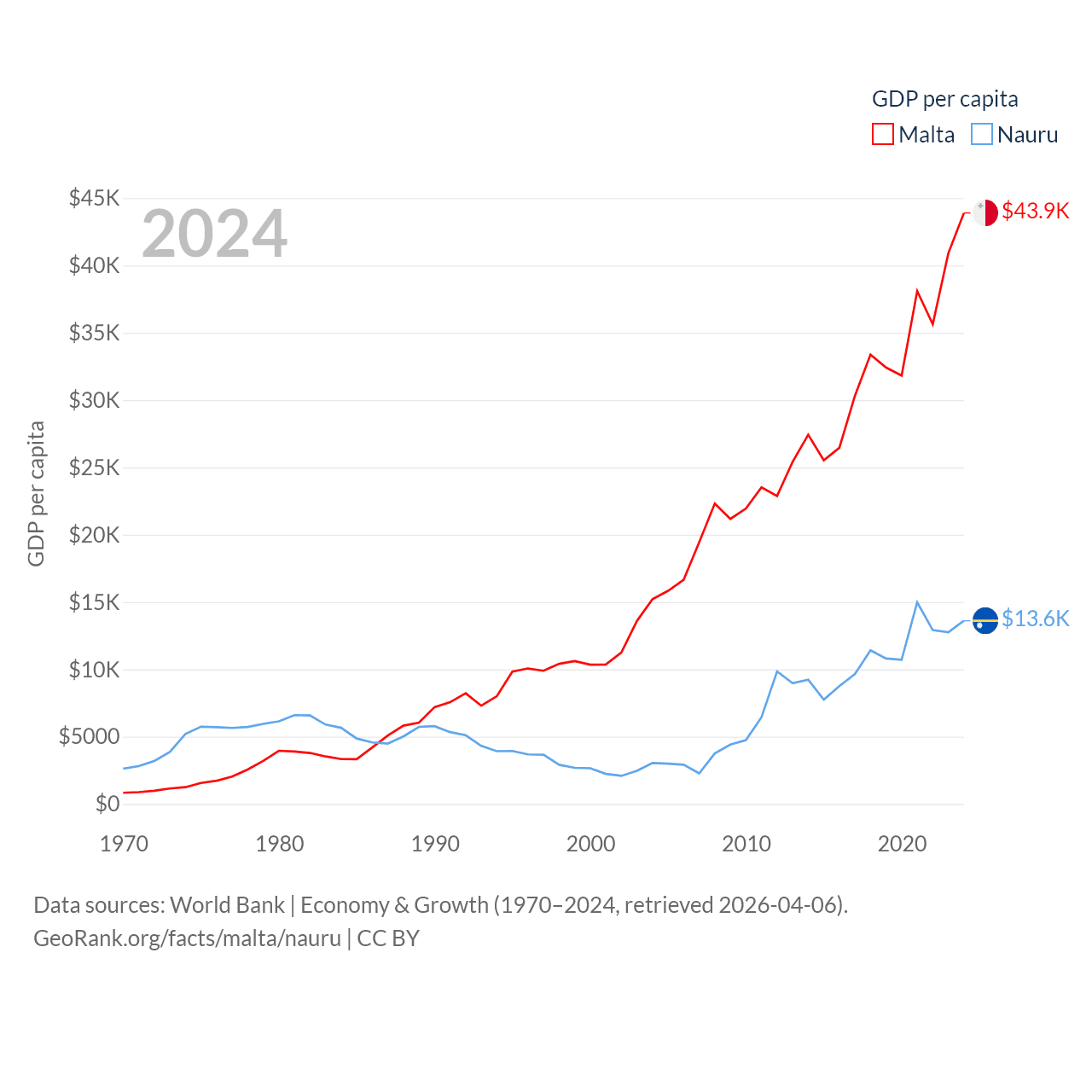 By GDP, Malta ranks 119/197 ($25B) and Nauru ranks 195/197 ($163M). By GDP per capita, Malta ranks 28/197 ($43,899), while Nauru ranks 74/197 ($13,609).