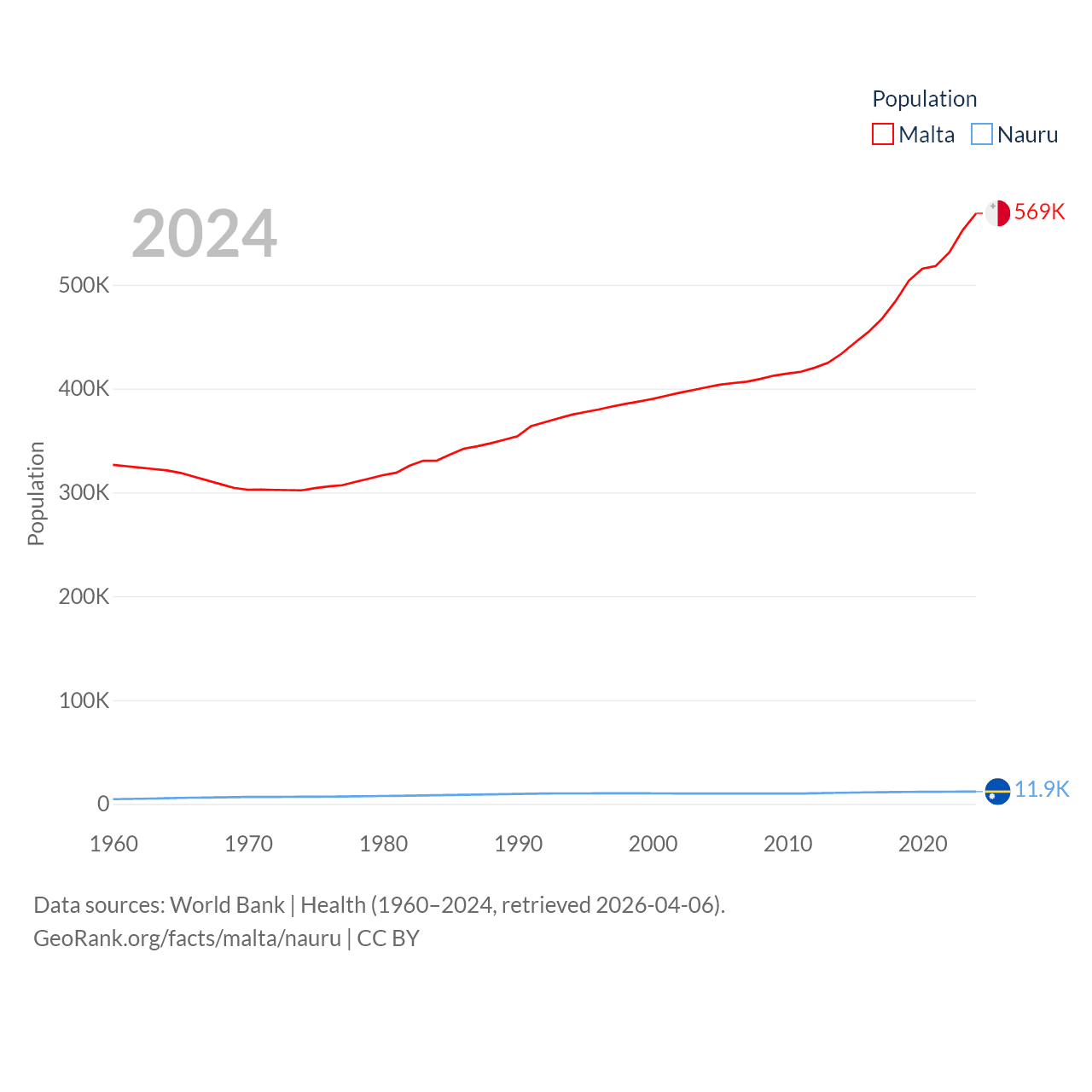 Malta has a population of 569K (ranked 167/197), compared with 11.9K in Nauru (ranked 195/197). Malta's land area is 123.6 sq mi versus 7.72 sq mi for Nauru (ranked 187th vs. 195th).