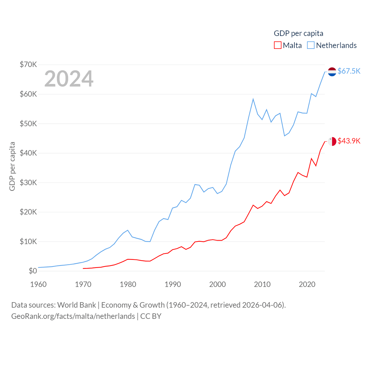 By GDP, Malta ranks 119/197 ($25B) and The Netherlands ranks 19/197 ($1.21T). By GDP per capita, Malta ranks 28/197 ($43,899), while The Netherlands ranks 13/197 ($67,520).