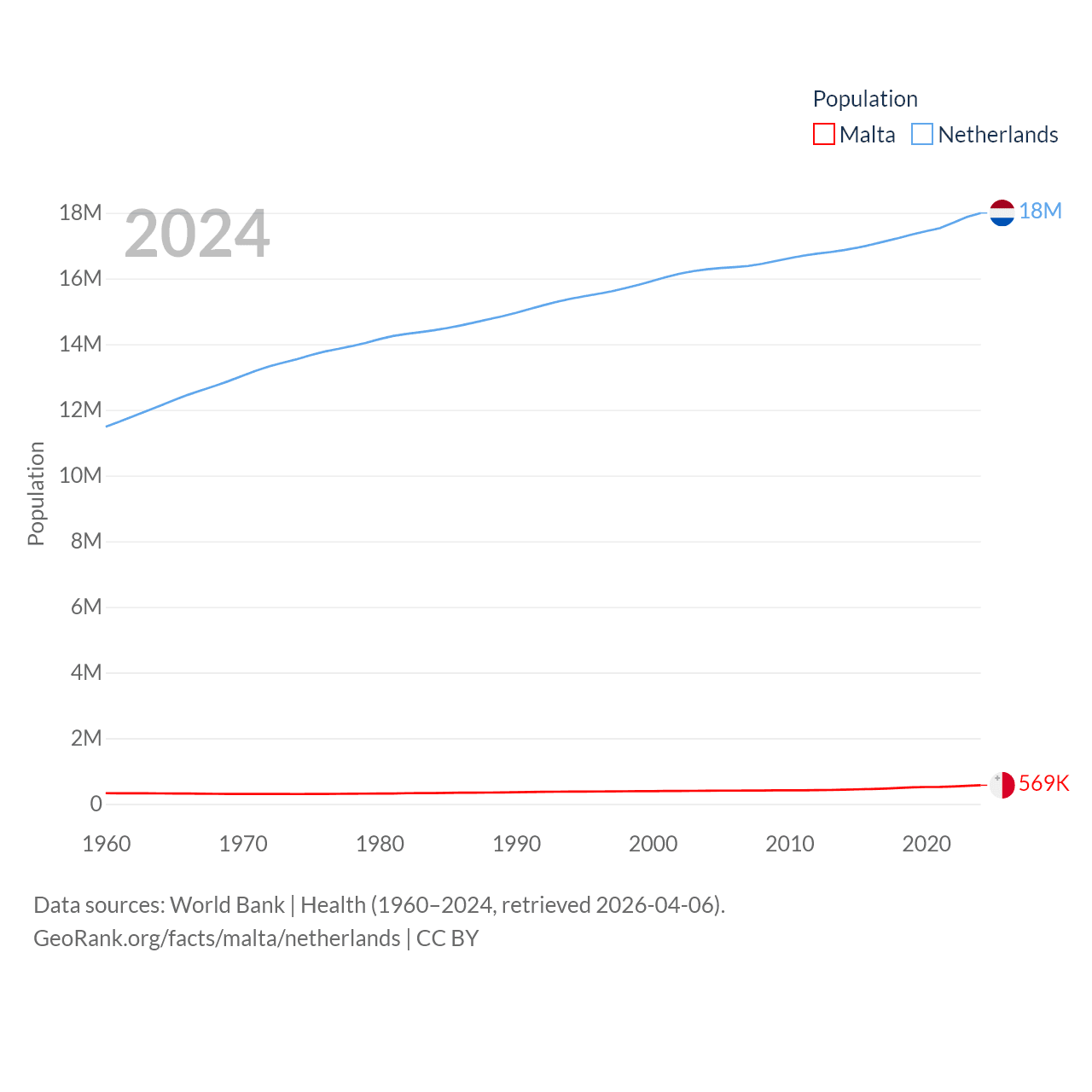 Malta has a population of 569K (ranked 167/197), compared with 18M in The Netherlands (ranked 72/197). Malta's land area is 123.6 sq mi versus 13,000 sq mi for The Netherlands (ranked 187th vs. 134th).
