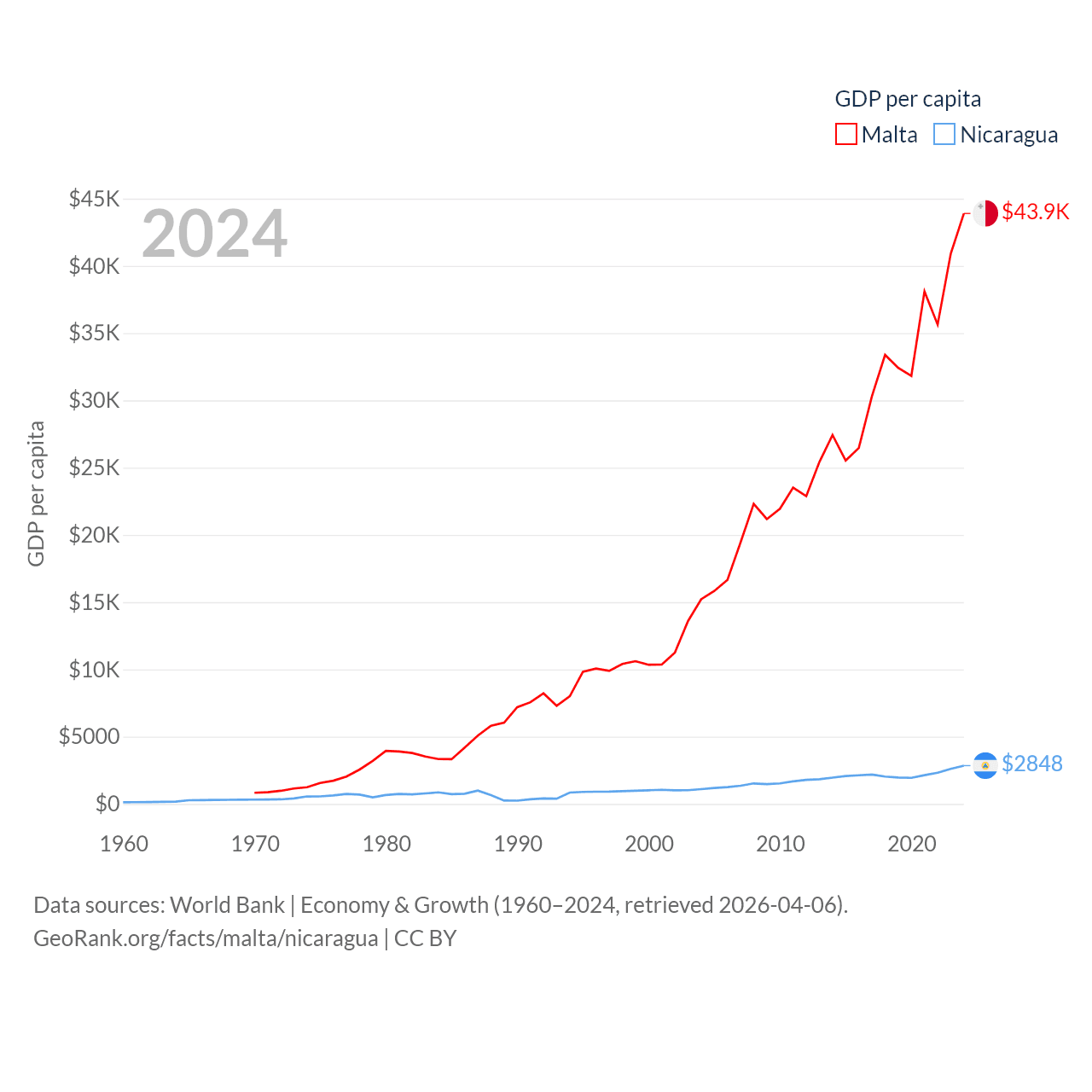 By GDP, Malta ranks 119/197 ($25B) and Nicaragua ranks 131/197 ($19.7B). By GDP per capita, Malta ranks 28/197 ($43,899), while Nicaragua ranks 141/197 ($2,848).