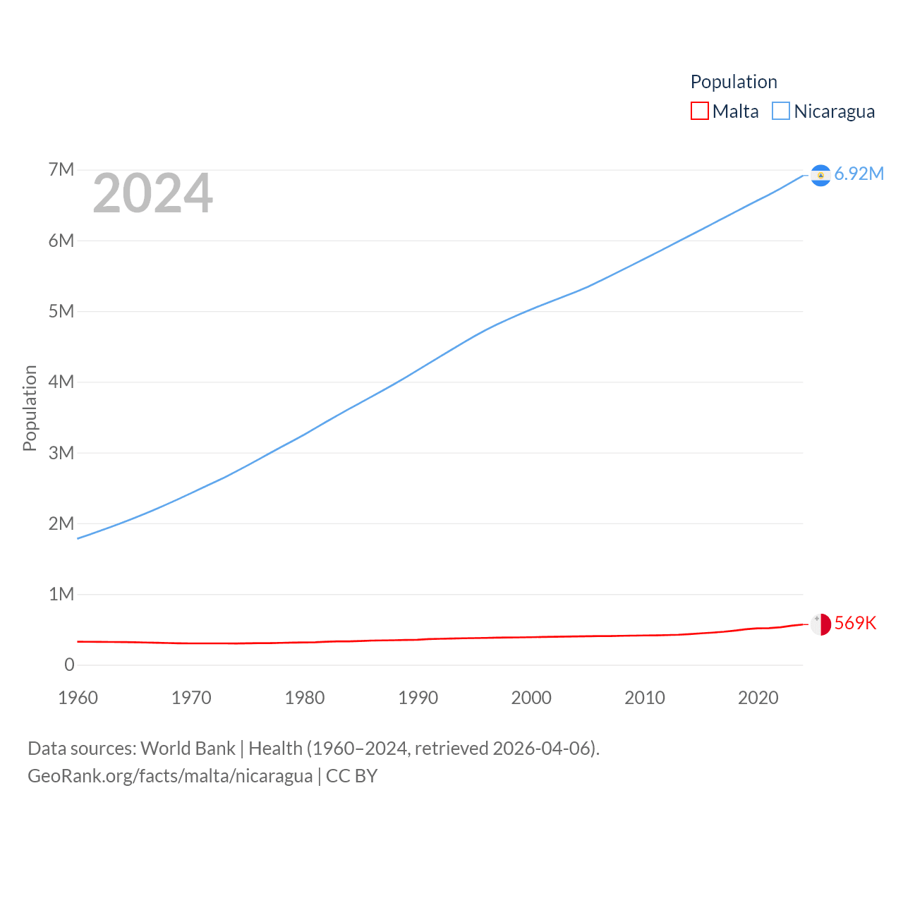 Malta has a population of 569K (ranked 167/197), compared with 6.92M in Nicaragua (ranked 108/197). Malta's land area is 123.6 sq mi versus 46,464 sq mi for Nicaragua (ranked 187th vs. 98th).