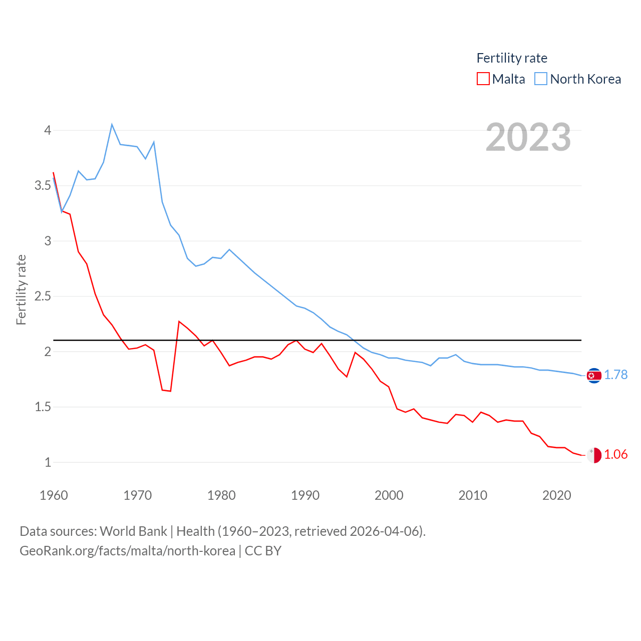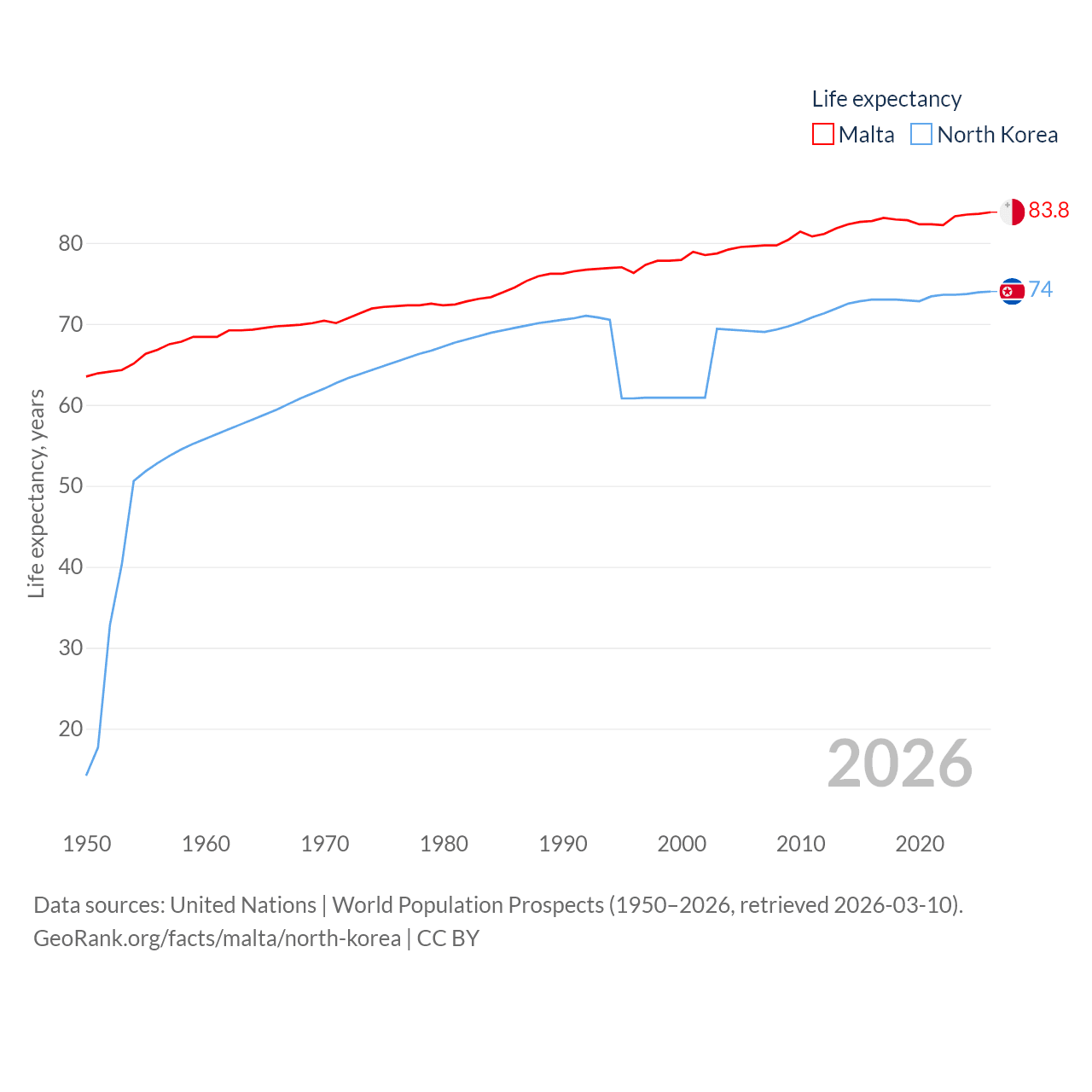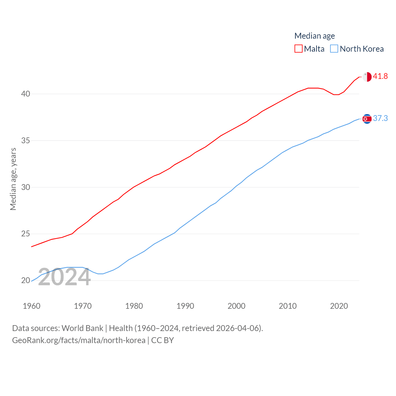 Malta has a population of 569K (ranked 167/197), compared with 26.5M in North Korea (ranked 56/197). Malta's land area is 123.6 sq mi versus 46,491 sq mi for North Korea (ranked 187th vs. 97th).