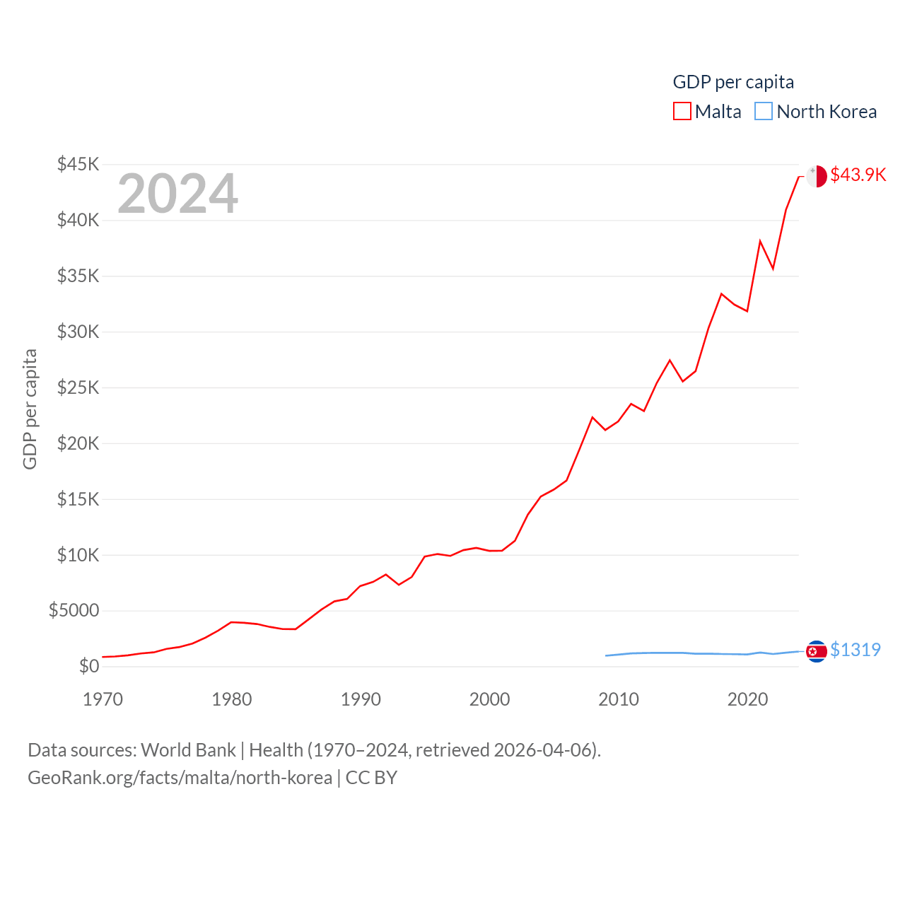 By GDP, Malta ranks 119/197 ($25B) and North Korea ranks 106/197 ($34.9B). By GDP per capita, Malta ranks 28/197 ($43,899), while North Korea ranks 168/197 ($1,319).