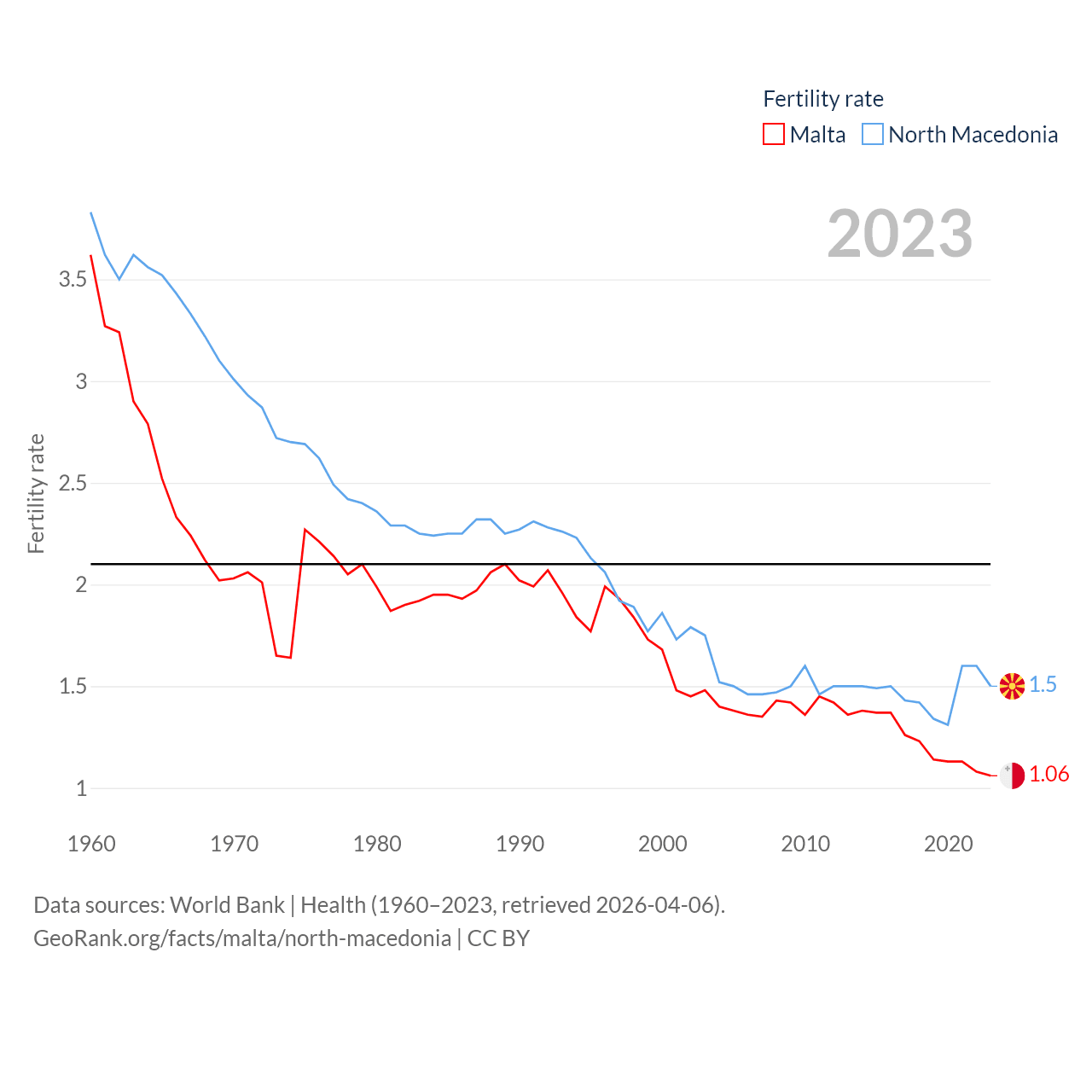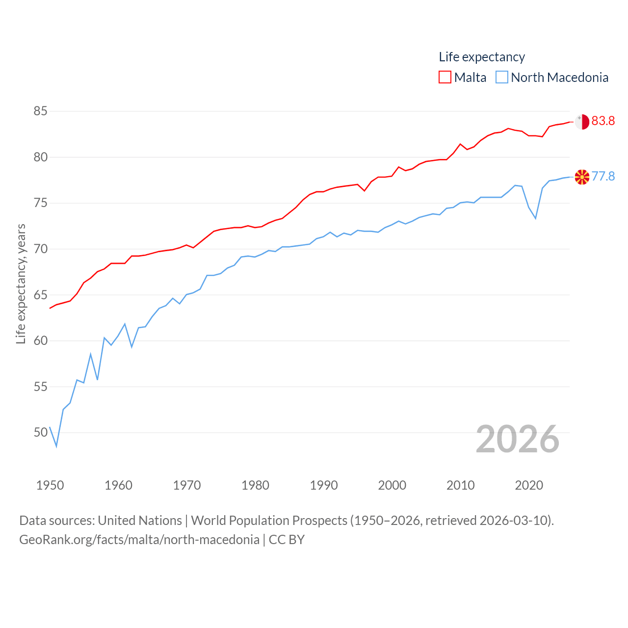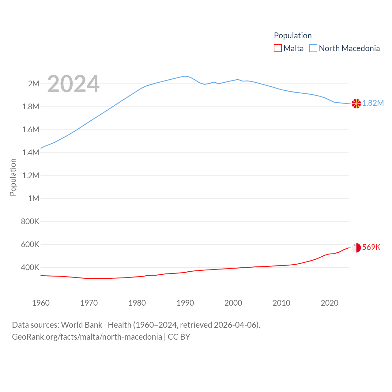 Malta has a population of 569K (ranked 167/197), compared with 1.82M in North Macedonia (ranked 150/197). Malta's land area is 123.6 sq mi versus 9,737 sq mi for North Macedonia (ranked 187th vs. 145th).