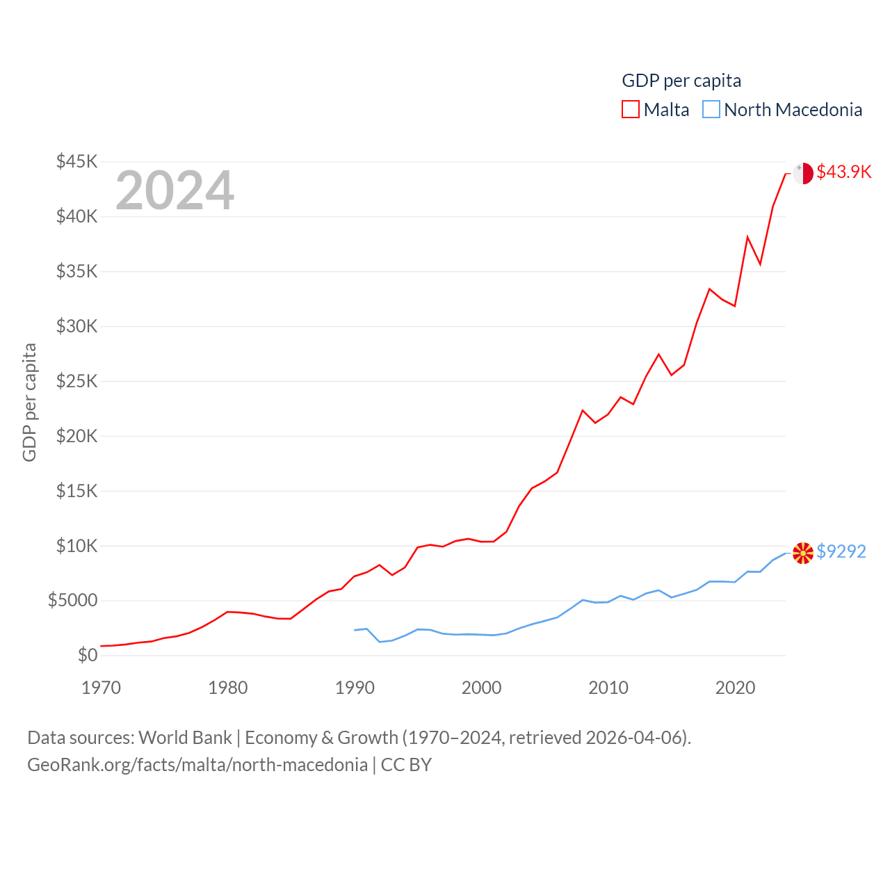 By GDP, Malta ranks 119/197 ($25B) and North Macedonia ranks 138/197 ($17B). By GDP per capita, Malta ranks 28/197 ($43,899), while North Macedonia ranks 88/197 ($9,292).