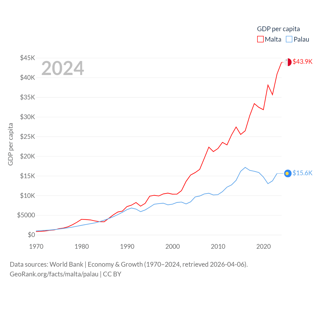 By GDP, Malta ranks 119/197 ($25B) and Palau ranks 194/197 ($277M). By GDP per capita, Malta ranks 28/197 ($43,899), while Palau ranks 67/197 ($15,611).