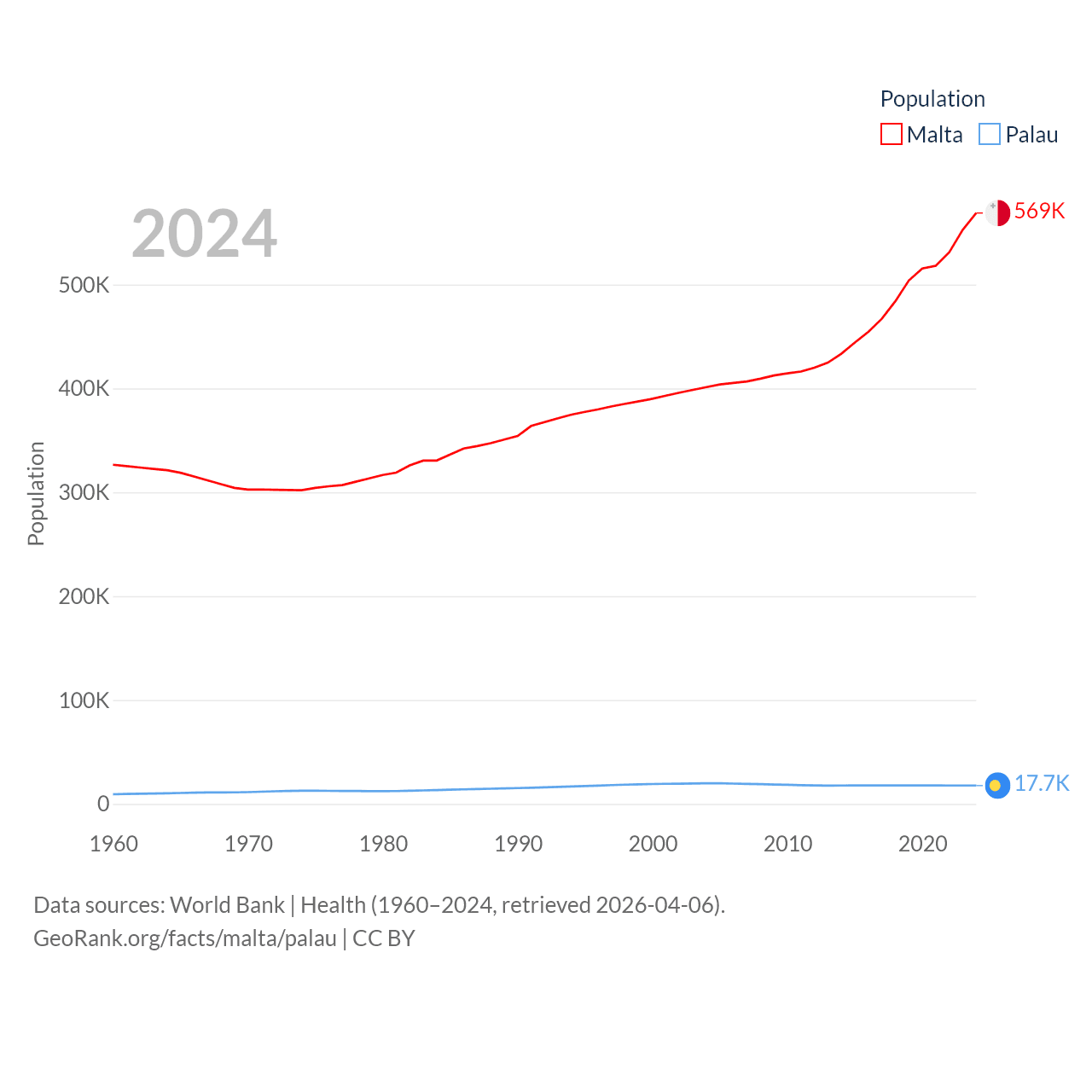 Malta has a population of 569K (ranked 167/197), compared with 17.7K in Palau (ranked 194/197). Malta's land area is 123.6 sq mi versus 177.6 sq mi for Palau (ranked 187th vs. 180th).