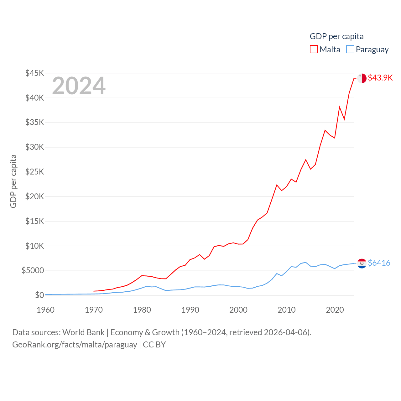 By GDP, Malta ranks 119/197 ($25B) and Paraguay ranks 98/197 ($44.5B). By GDP per capita, Malta ranks 28/197 ($43,899), while Paraguay ranks 109/197 ($6,416).