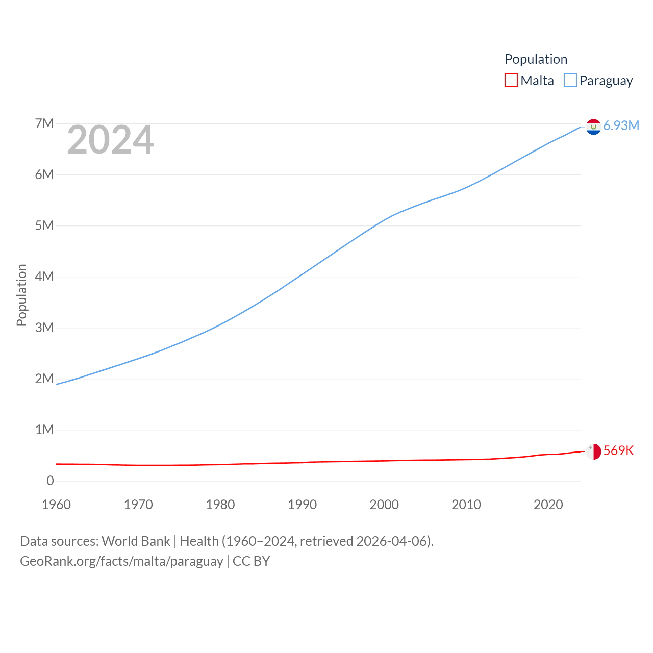 Malta has a population of 569K (ranked 167/197), compared with 6.93M in Paraguay (ranked 107/197). Malta's land area is 123.6 sq mi versus 152,901 sq mi for Paraguay (ranked 187th vs. 59th).