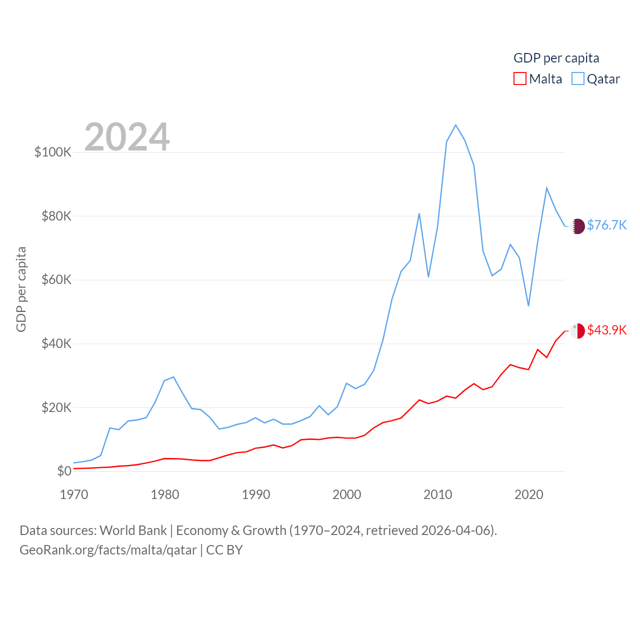 By GDP, Malta ranks 119/197 ($25B) and Qatar ranks 56/197 ($219B). By GDP per capita, Malta ranks 28/197 ($43,899), while Qatar ranks 11/197 ($76,689).